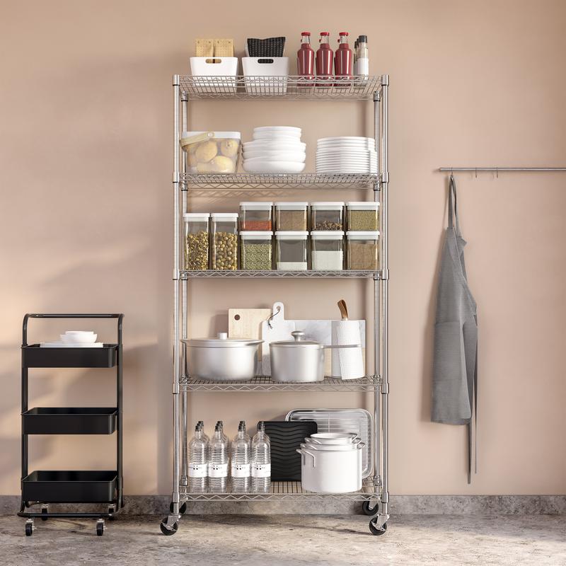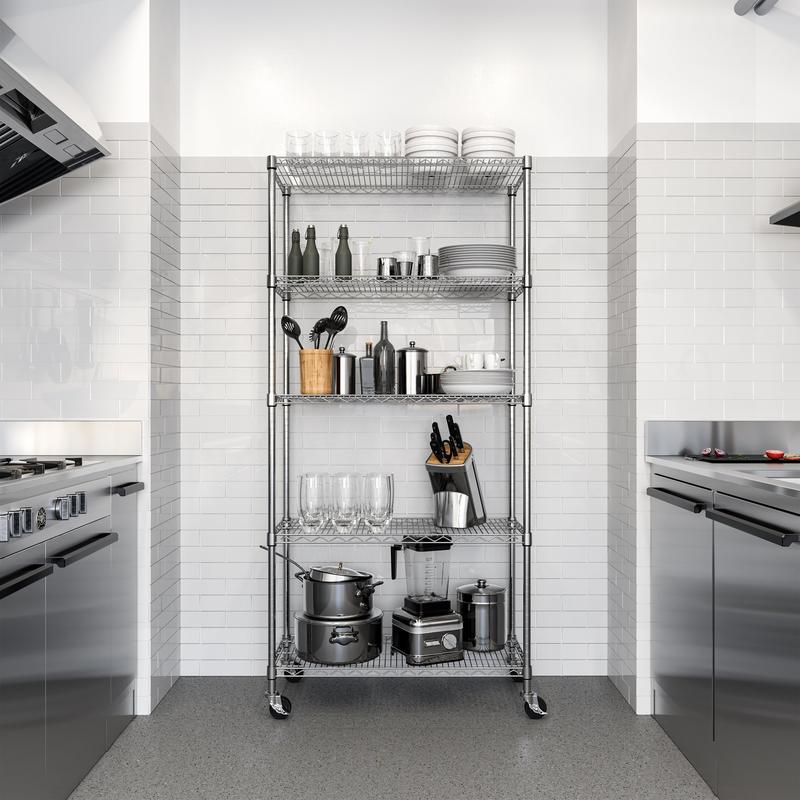 ·5 heavy-duty steel wire shelves - height adjustable at 1" incrementsExtra silver steel wire shelf available for purchase hereExtra black steel wire shelf available for purchase hereExtra white steel wire shelf available for purchase here