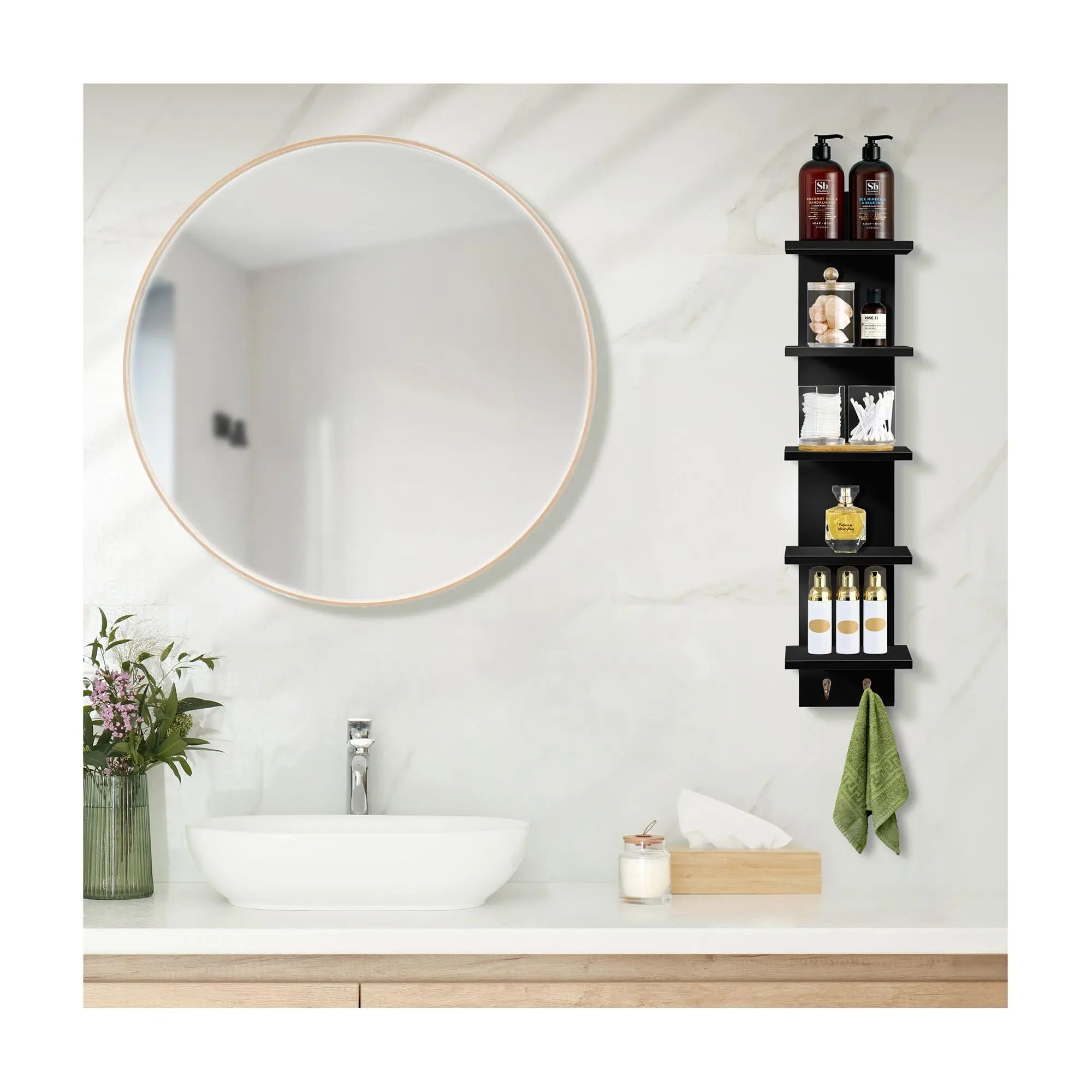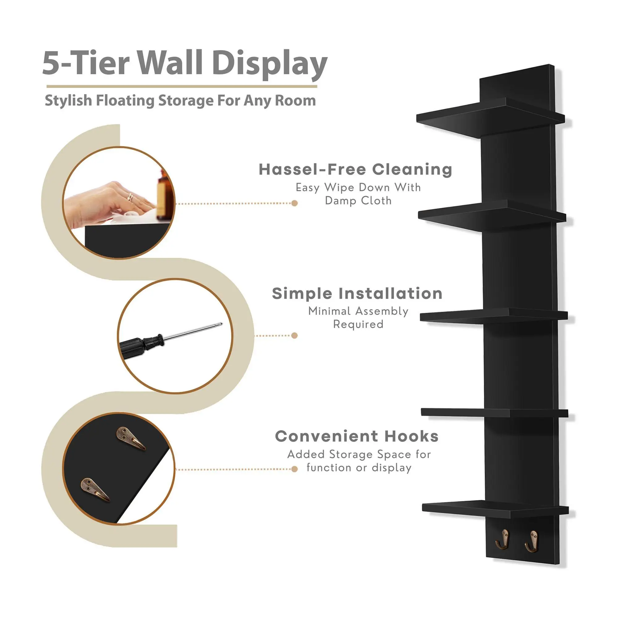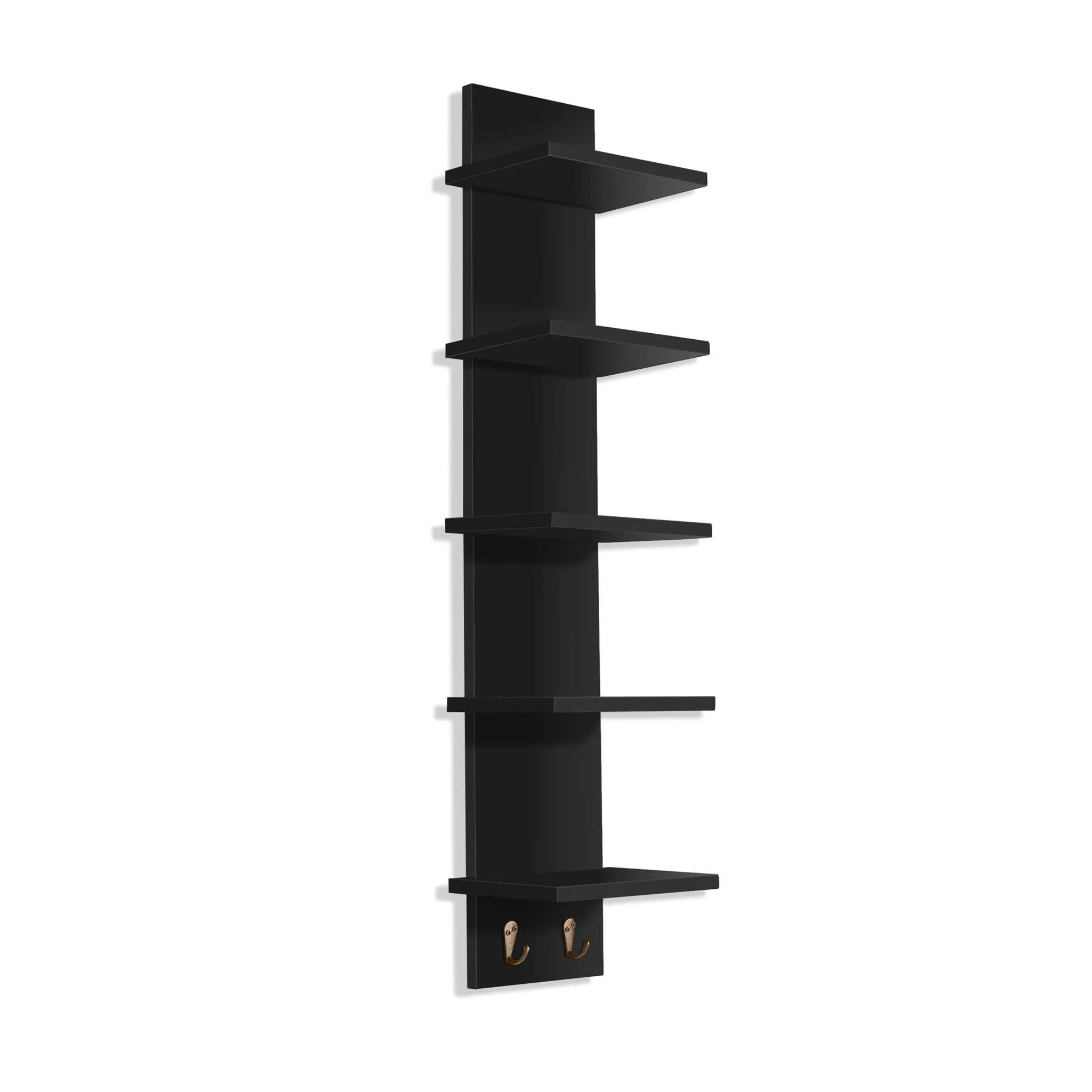 Add a splash of modern elegance to your home with this floating vertical shelf unit, featuring five square tiers and two convenient hooks. Ideal for any room, it provides a stylish solution for storing and displaying your favorite books, decor, and everyday essentials. Whether in the kitchen, bathroom, or living room, this sleek shelf maintains a minimalist appearance while offering ample space. From Sorbus.