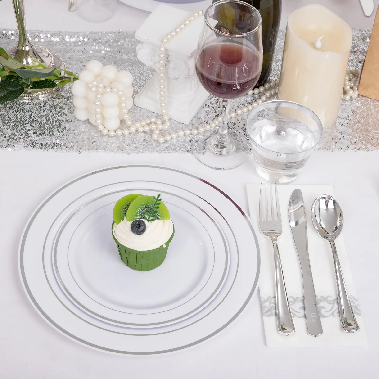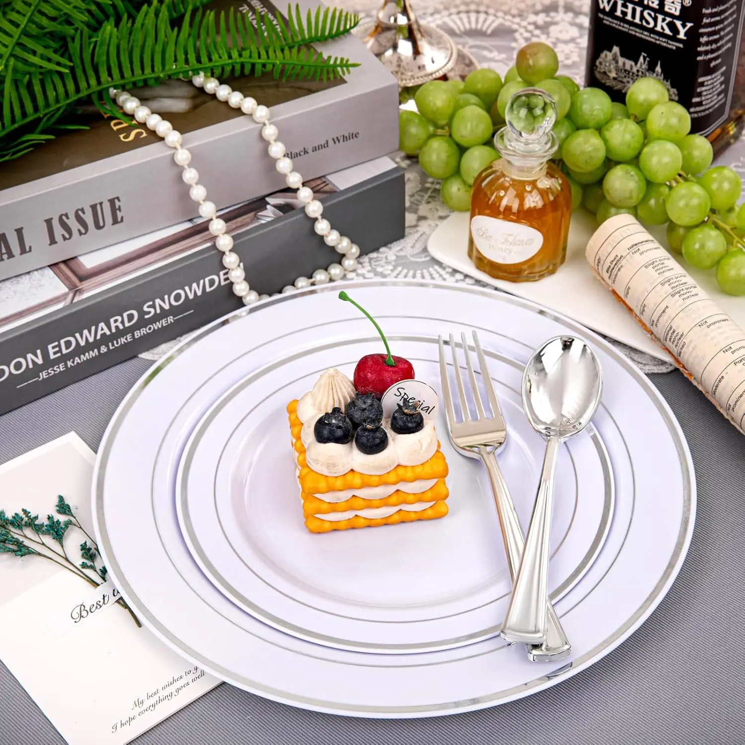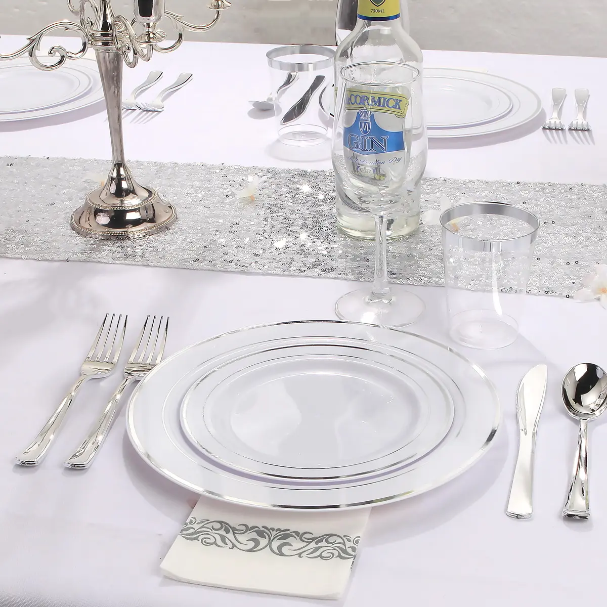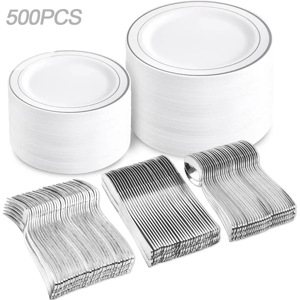 700Silver:Plastic Plates Disposable for 25 Guests Include: 100 Guests-100 Dinner Plates, 100 Dessert Plates, 100 Disposable Cups 10 oz, 100 Paper Napkins, 100 Plastic Silverware Set Perfect for Party & Wedding