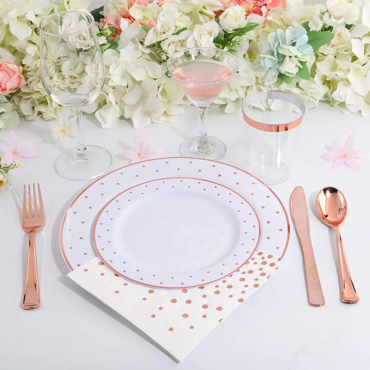 350 Rose Gold:Plastic Plates Disposable for 25 Guests Include:50 Dinner Plate, 50 Dessert Plate, 50 Forks, 50 Knives, 50 Spoons, 50 Cups, 50 Dot Napkins for Weddings and Party