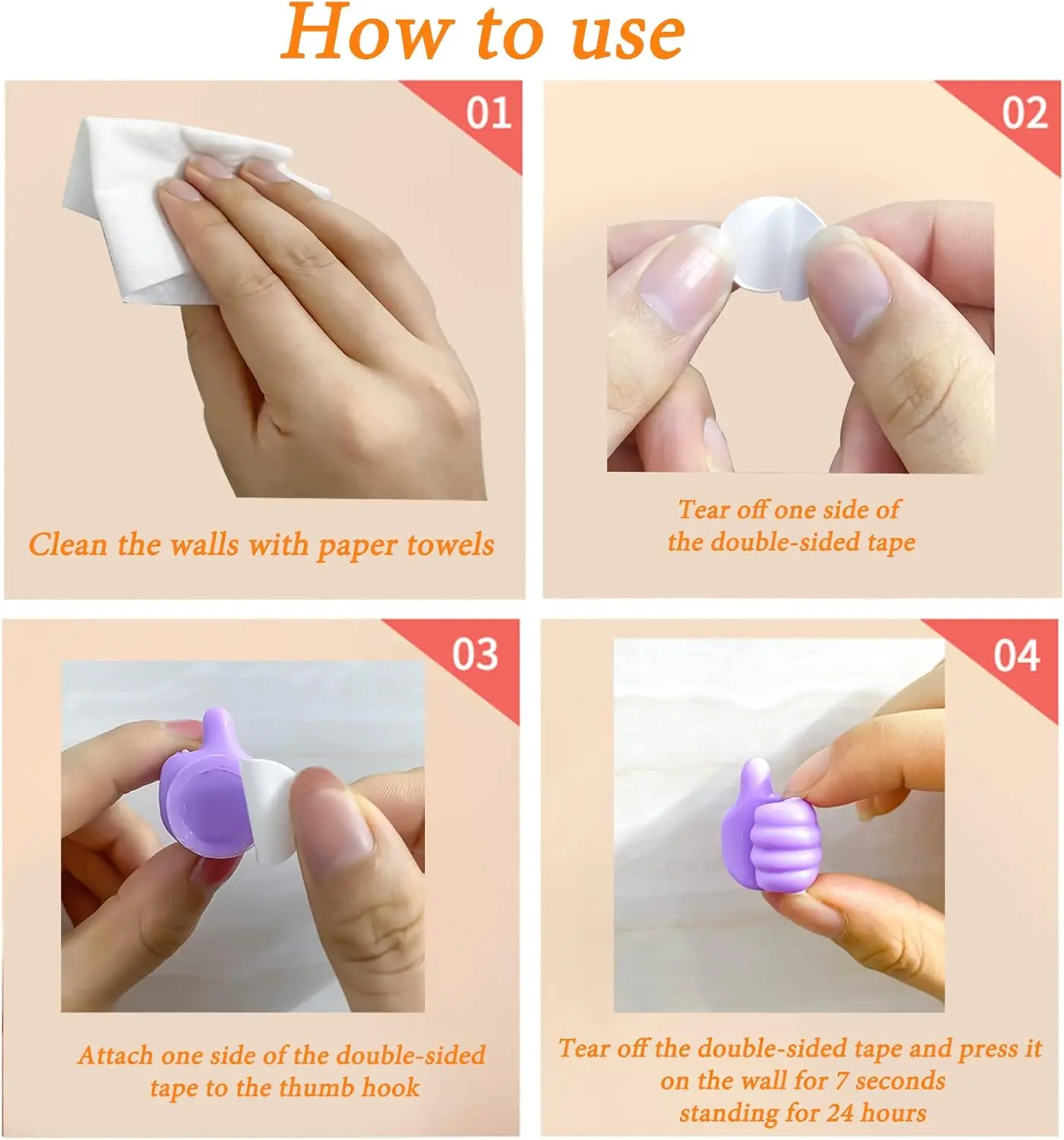 No Hole Punching, Easy to Use 🛠️- Self-adhesive thumb-shaped hooks- Stick double-sided tape- Peel off protective layer- Stick on any smooth surface- No breakage- No residual adhesive- Strong load-bearing capacity
