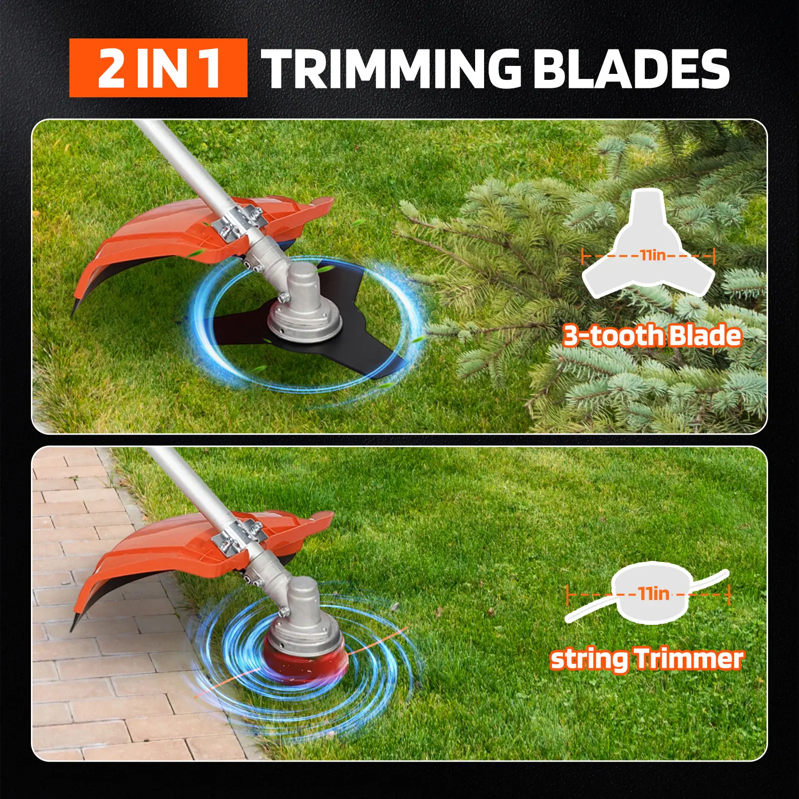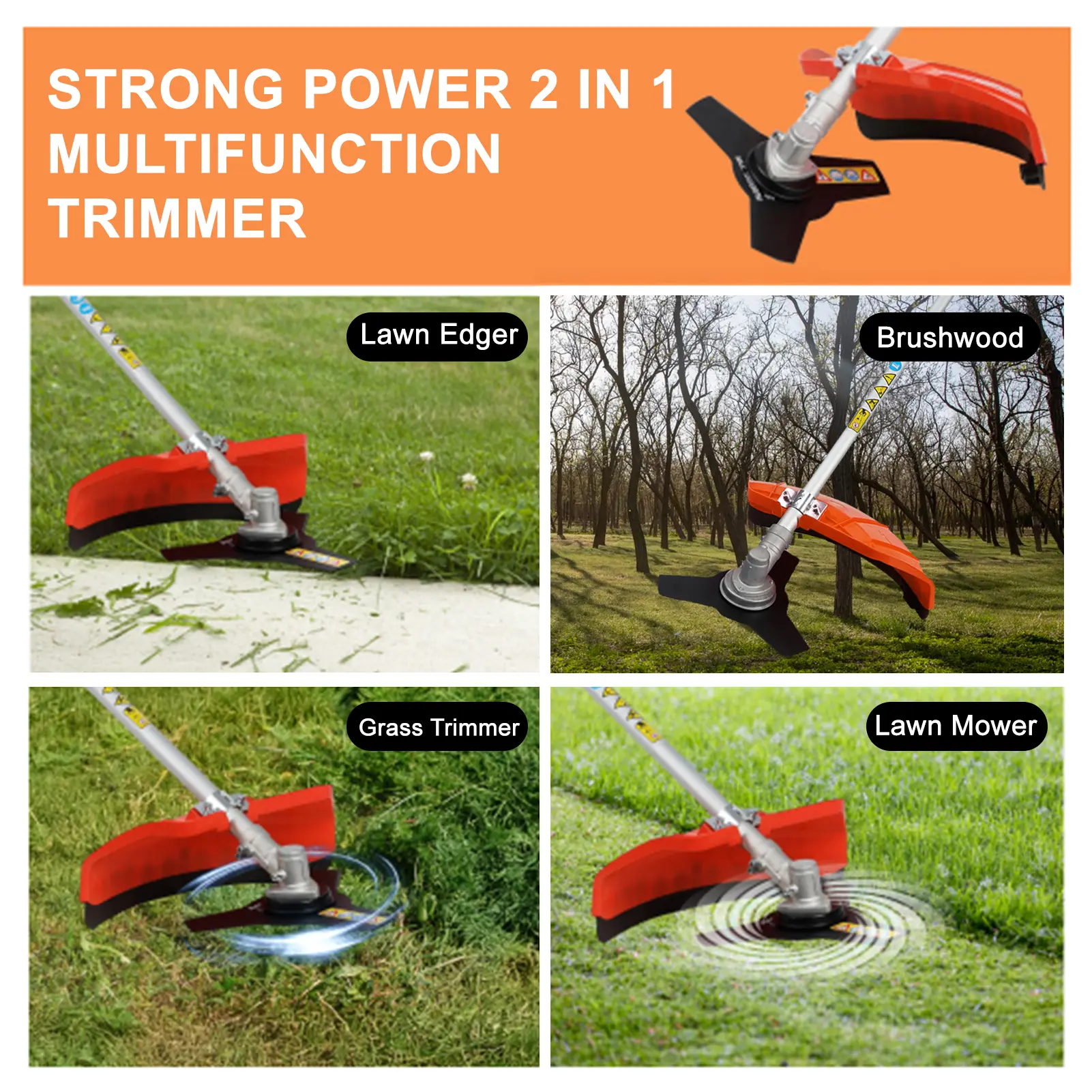2 in 1 Trimmer/Edger & Widely Applicable: Gas weed wacker with 10" brush cutter & 0.09" trimmer line head. Easily switches for grass or heavy bush. Ideal for yards and lawns. Perfect for home, yard, garden and so on. With this tool you can take on your whole garden, from sorting out your grassy edges with the trimmer, to trimming bushes and roots with the brush cutter, to pruning your hedges and bushes with the hedge trimmer and finally tackling the tougher, thicker branches with the gas cordless cutter.