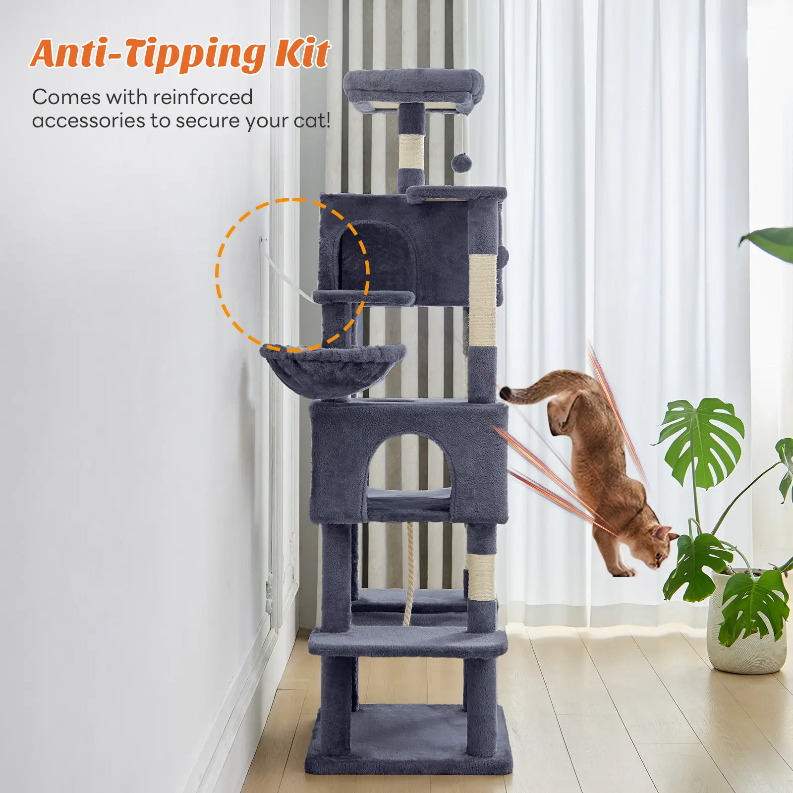 Durability: Great! Depends on how much tough tighten and if you secure it to the wall. My cat flops around on it and it doesn’t dhake