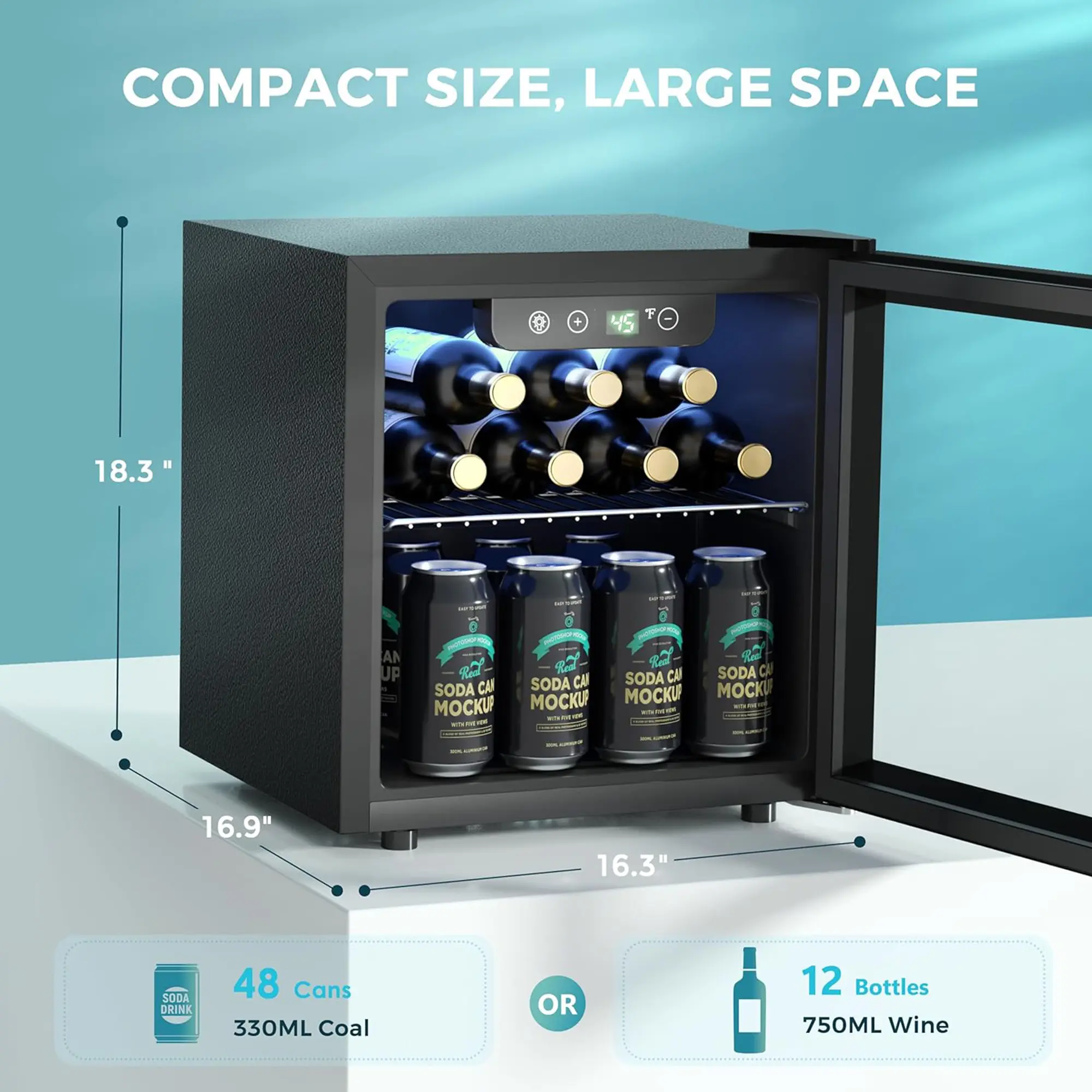 ·PORTABLE DESIGN-The beverage fridge is compact and takes up very little space, so it can be placed on the bedside, counter or wall corner, and its stylish appearance matches most indoor and outdoor styles. Inside, the mini fridge glass door has a 1.3 cuft capacity and can hold up to 48 cans of beer