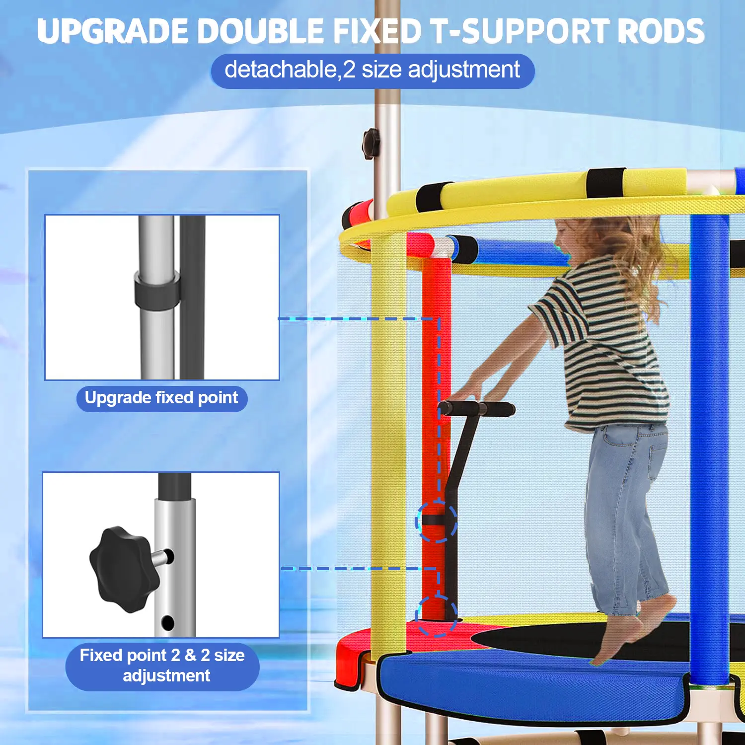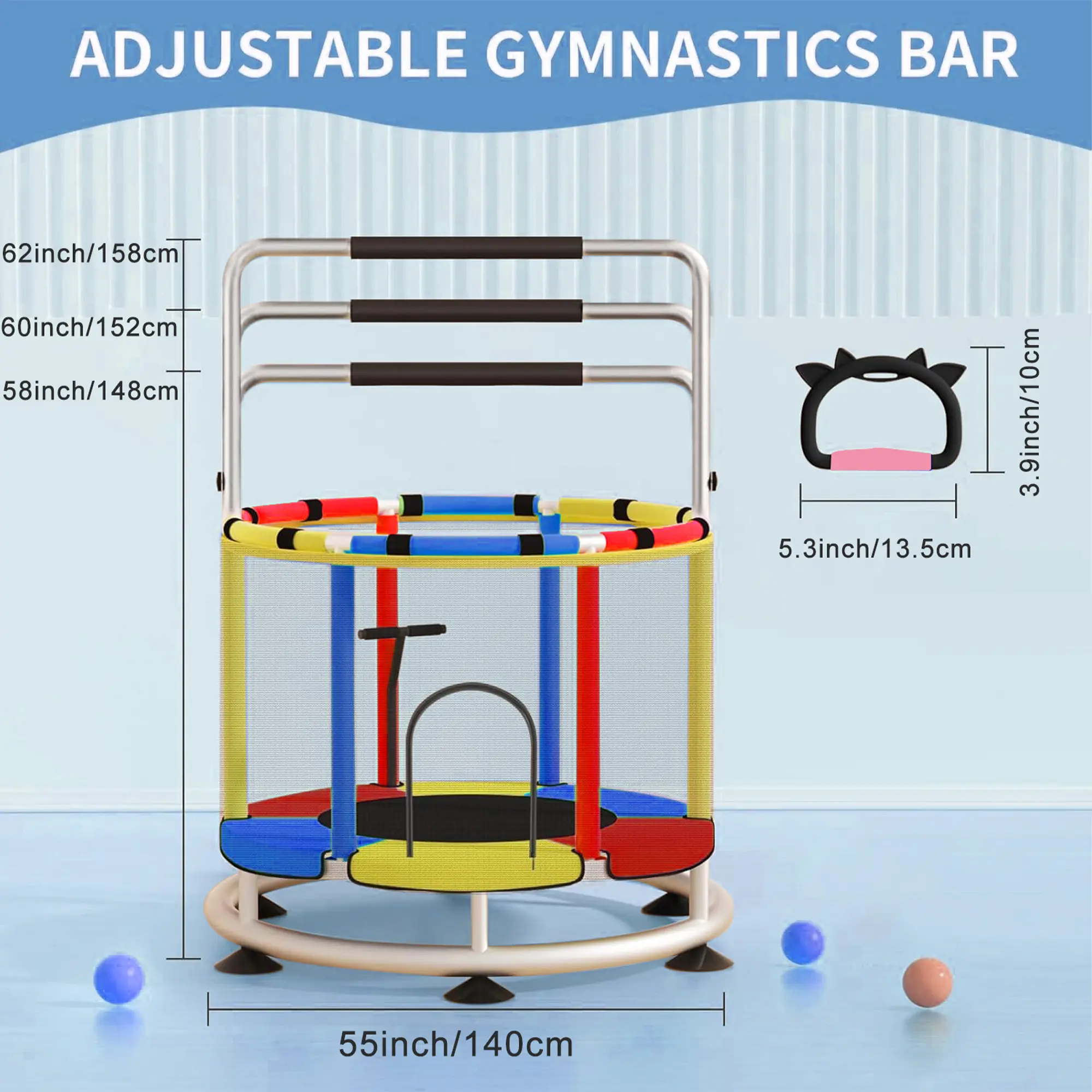 ·【 3 adjustable height 】 The trampoline includes a 3-level adjustable height of the horizontal bar height design, which can be removed when not needed, and the top is provided with a safety seal for children to play with peace of mind. It can be adjusted from 59 inches to 60 or 62 inches. If your child is addicted to electronics and lacks exercise, you may consider choosing this trampoline