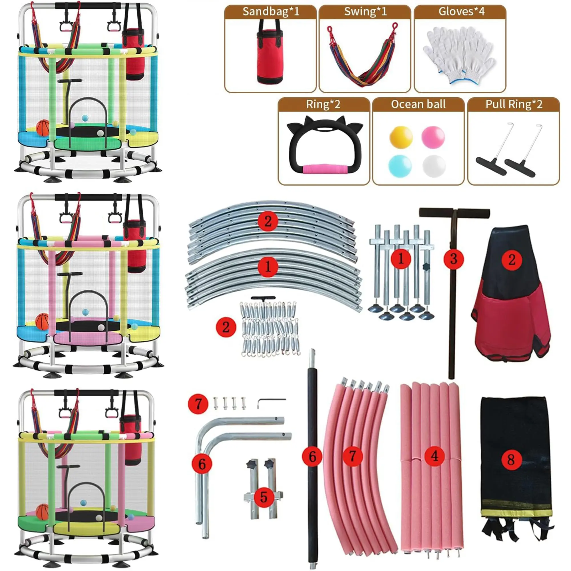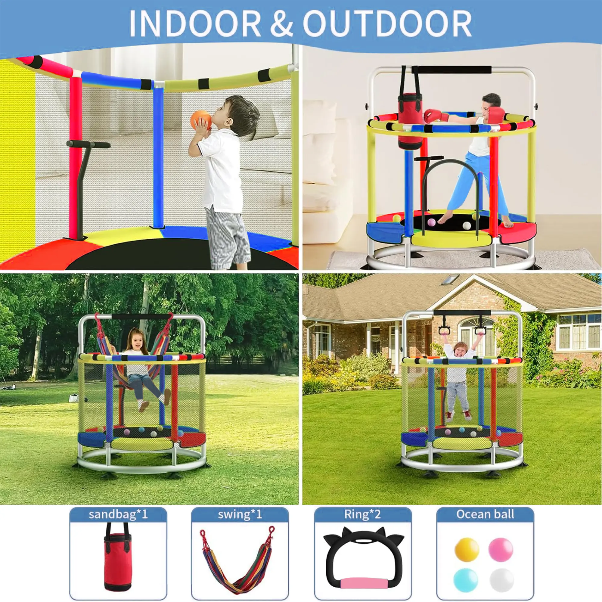 ·【 Easy to assemble & Free accessories 】 Instructions for individual packaging and installation video. It can accommodate 3 children from 1 to 8 years old, and accessories including rings, swings, sandbags, ocean balls, baskets, etc., can provide more fun for your children while jumping.