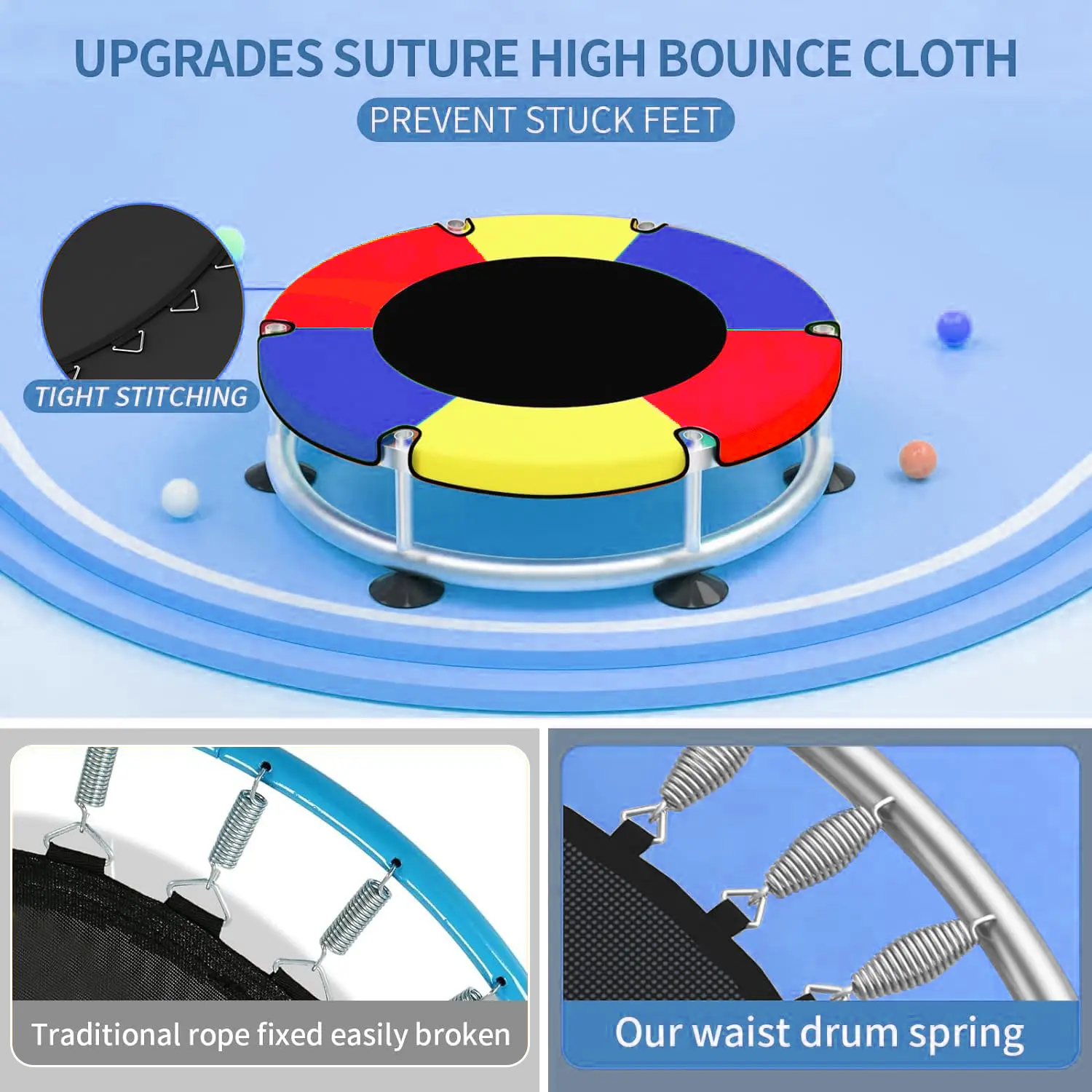 ·【 Upgrade non-gap 360° Enclosure Net safety design & leak-proof high bounce cloth 】 360° surround thick encryption protective net, upgrade bottom of the Enclosure Net can be removed, compared with ordinary trampoline upgrade to high elastic tightly stitched one jump cloth, 3 layers of thick safety pad, to prevent children from stepping on feet. Customized thick waist drum spring, lasting without deformation, for children indoors and outdoors to eliminate worries