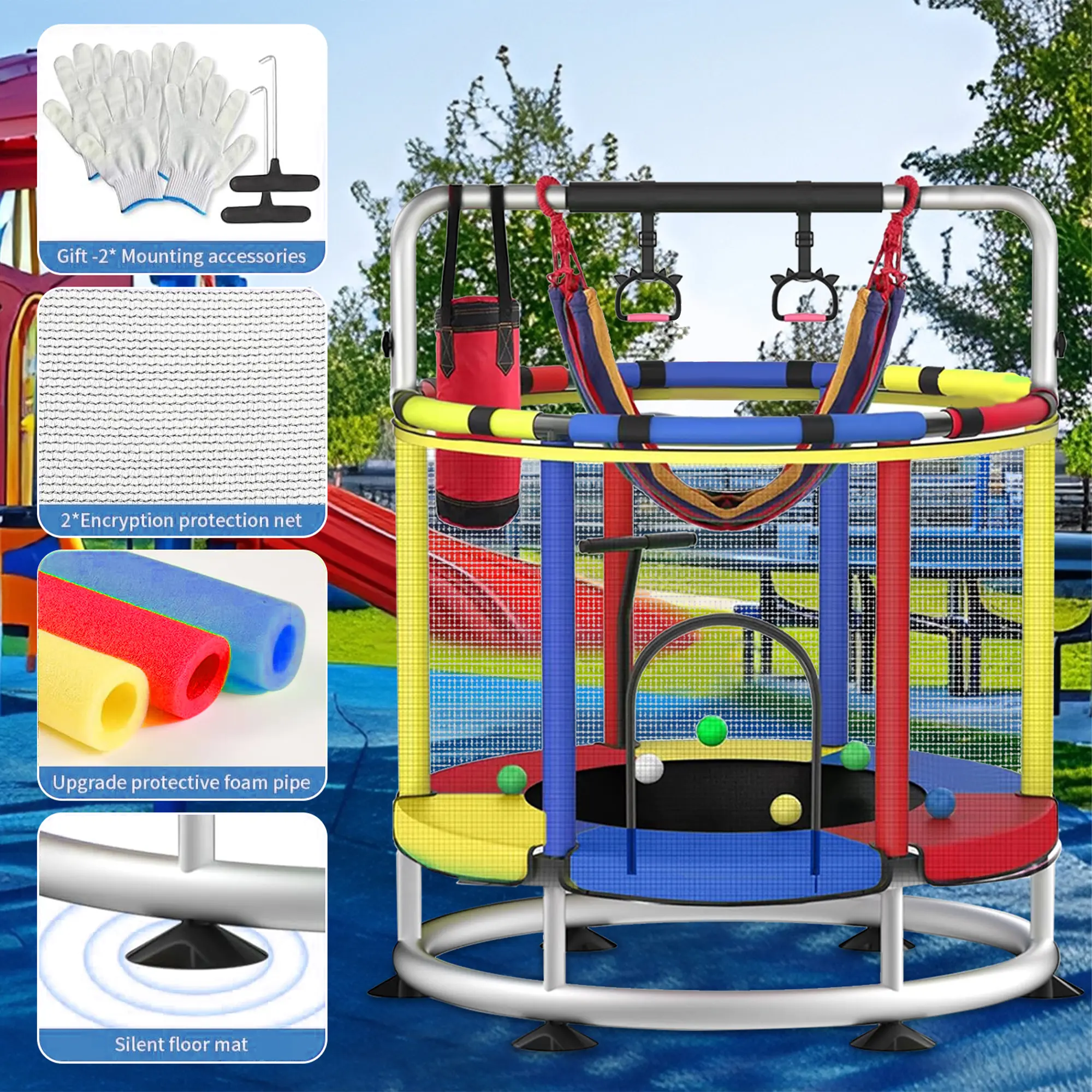 ·【 Upgrade Silent suction mat 】 Children's trampoline thickened anti-collision foam tube. Stabilize the trampoline with three sets of U-feet. Each U-tube is equipped with two enhanced silent suction pads, which can effectively mute the trampoline and provide traction for the trampoline, effectively prevent tumbling, and let the child jump happily on the trampoline.