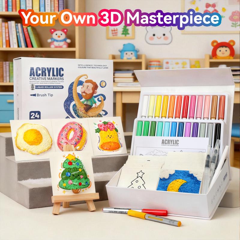 Bring your ideas to life with 24-Color Acrylic Creative Markers designed for smooth, bold, and layerable results on both light and dark surfaces. With a brush tip and a direct ink roller system, these markers deliver consistent flow without shaking or pressing, making them easy and enjoyable to use for everyday drawing, teaching, gifting, and creative projects.