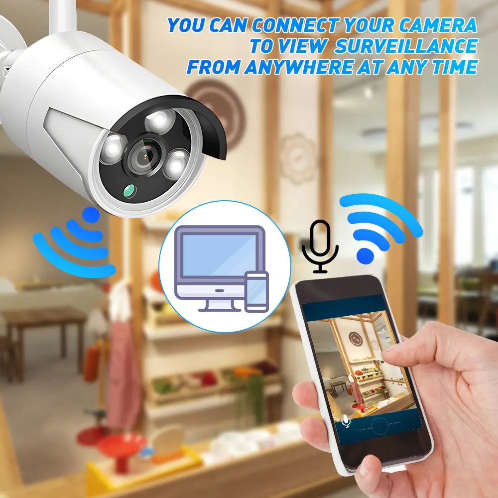 View from the app: Free app for real-time viewing and playback on smart devices. This wireless surveillance camera system allows you to remotely access anytime, anywhere via WiFi/4G on smartphones, tablets and PCs at the same time. Scan the QR code or download IP-Pro (free app) on your phone to complete super simple setup in seconds.