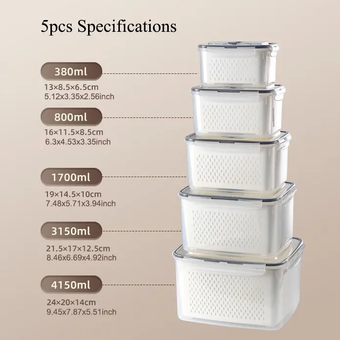 You will get 5 fridge storage containers with colander sizes from 380 ml to 4150 ml [ 13 oz, 27 oz, 57 oz, 106 oz, 140 oz ] .
