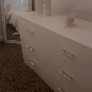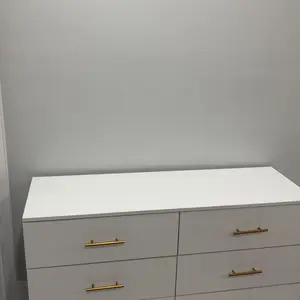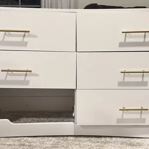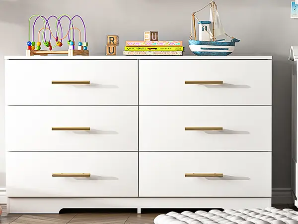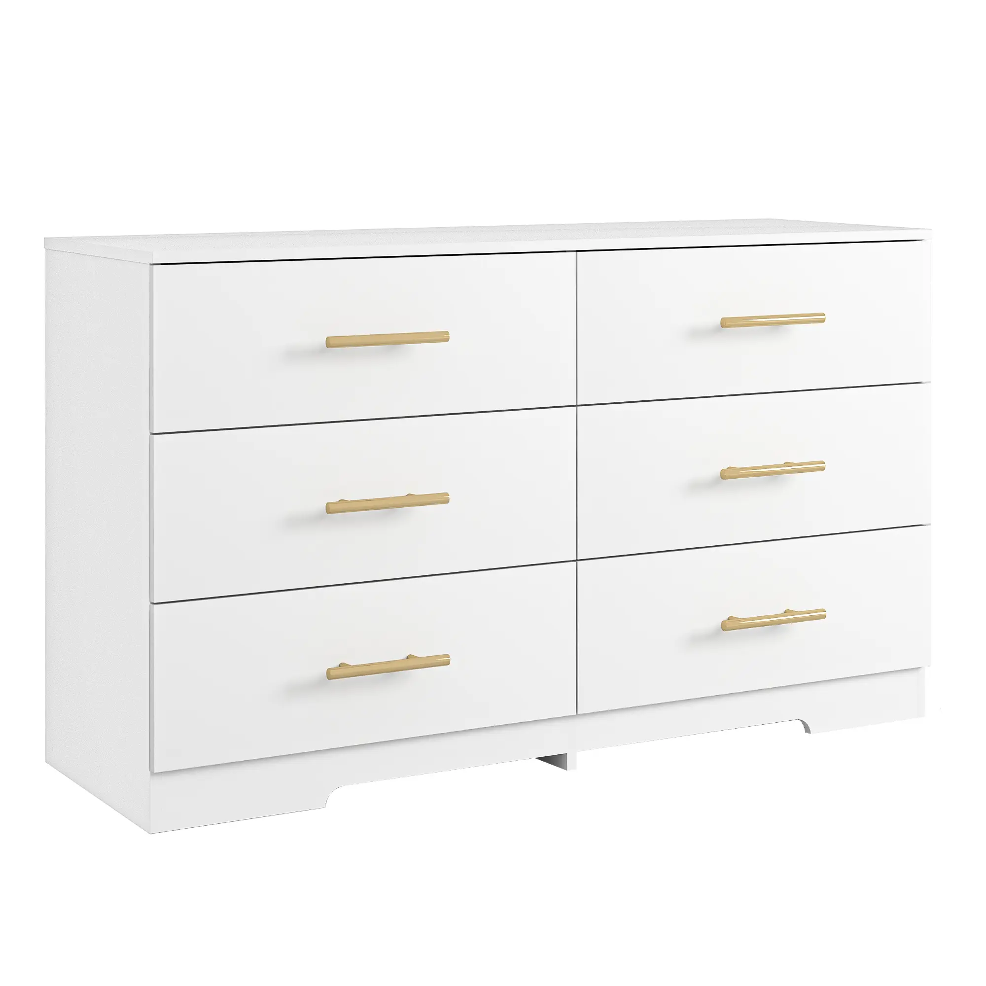 Introducing the Canddidliike 6-Drawer Dresser: The Ideal Bedroom Storage Solution Designed to enhance any bedroom decor, this rural-style dresser for bedroom offers an abundance of storage space combined with exquisite craftsmanship.With six smooth sliding drawers, organizing your belongings has never been easier. Whether you need to store clothing, accessories, or any personal items. It boasts a stunning appearance, accentuated by its golden surface and complemented by matte white hardware. Crafted from good-quality materials, including engineered wood, MDF, particleboard, and decorative laminate, the Canddidliike white dresser guarantees exceptional durability. Rest assured that this storage unit will reliably serve its purpose for years to come. Its sturdy construction ensures that it can withstand everyday use without compromising on functionality or style.