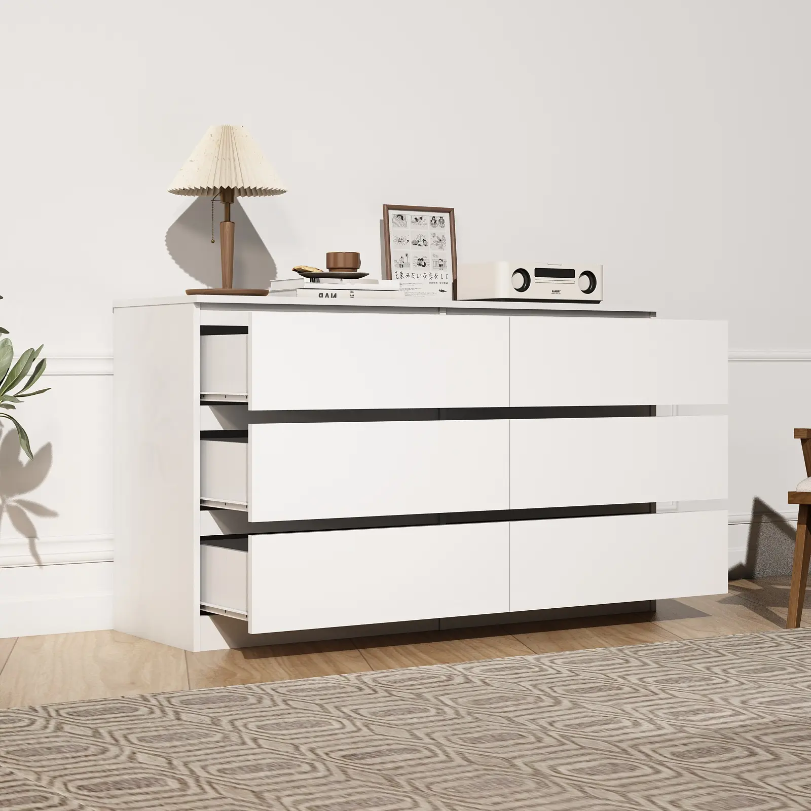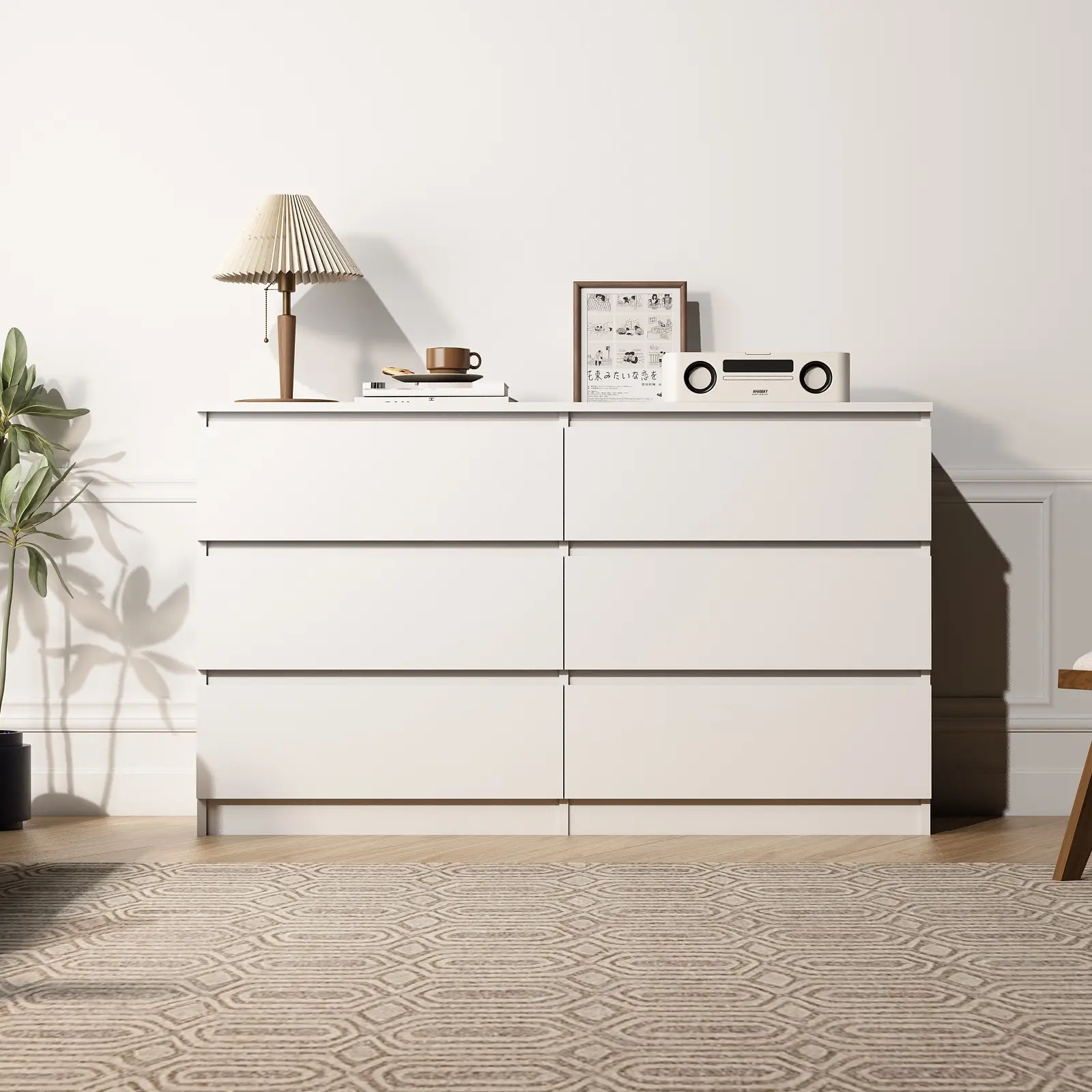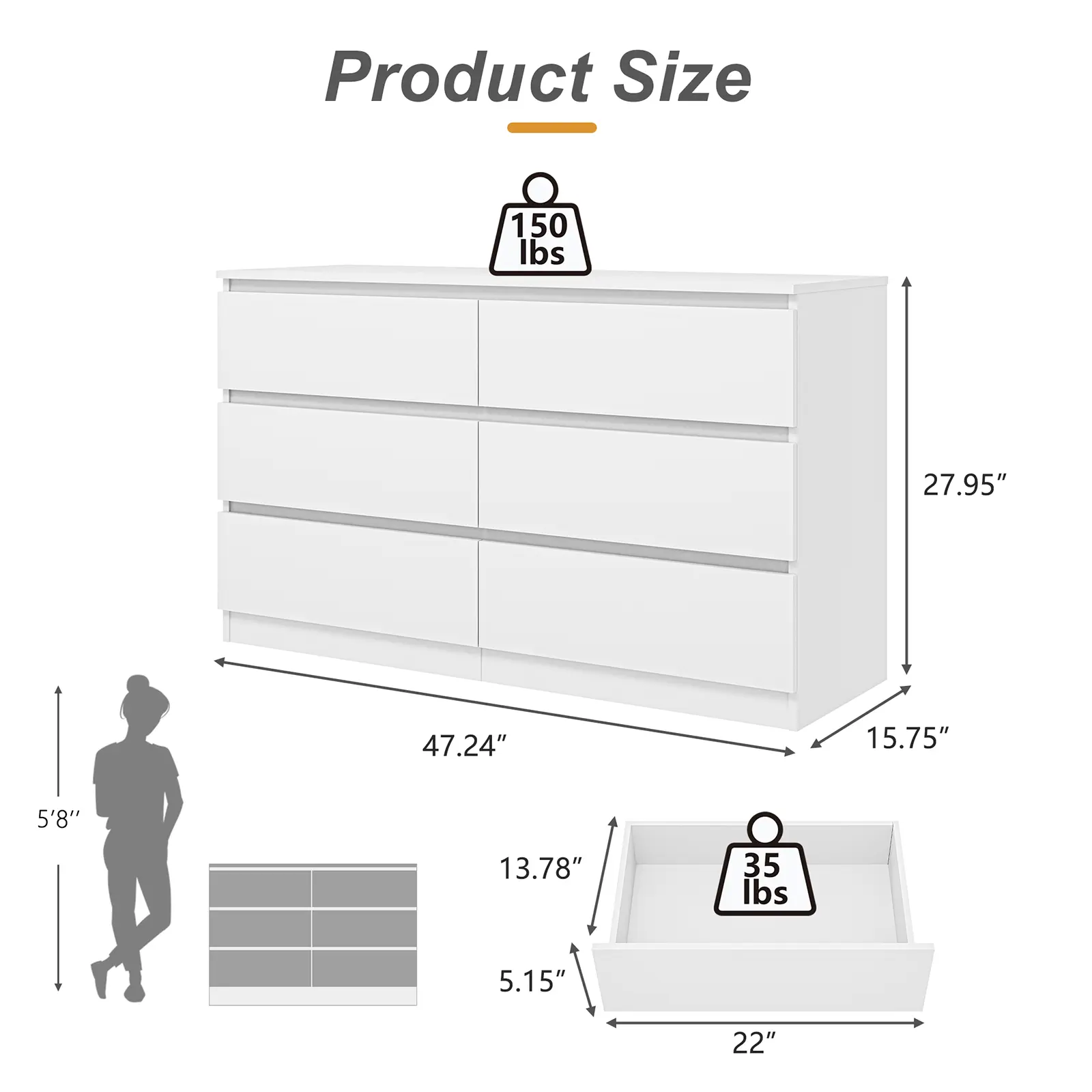 ·6 Oversized Drawers Dresser Each drawer (13.78*22*5.5 inches) can store a lot of books and magazines. On the top of the white dresser can place your favorite decorations, modern candlesticks, vases, lamps, and abstract decorations.