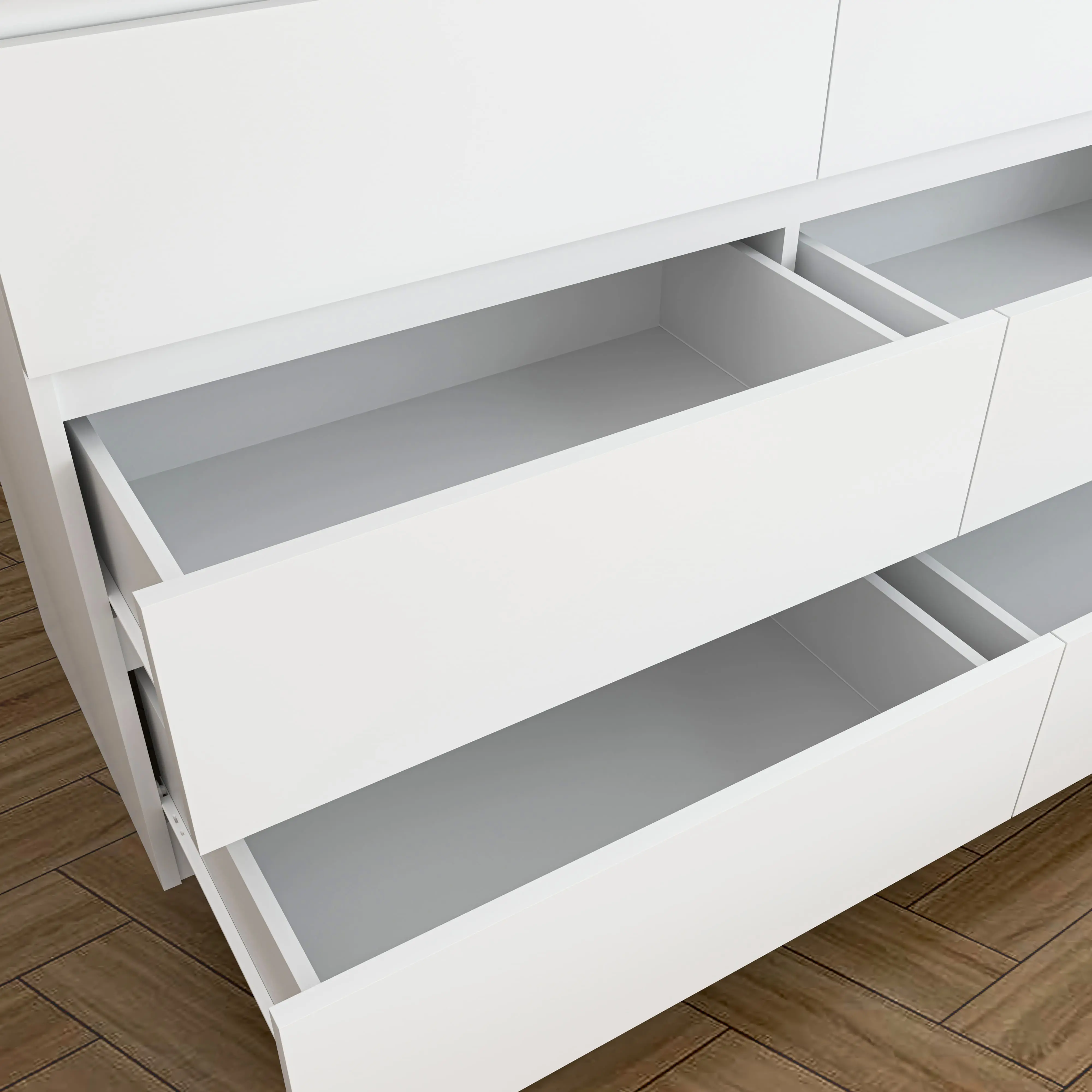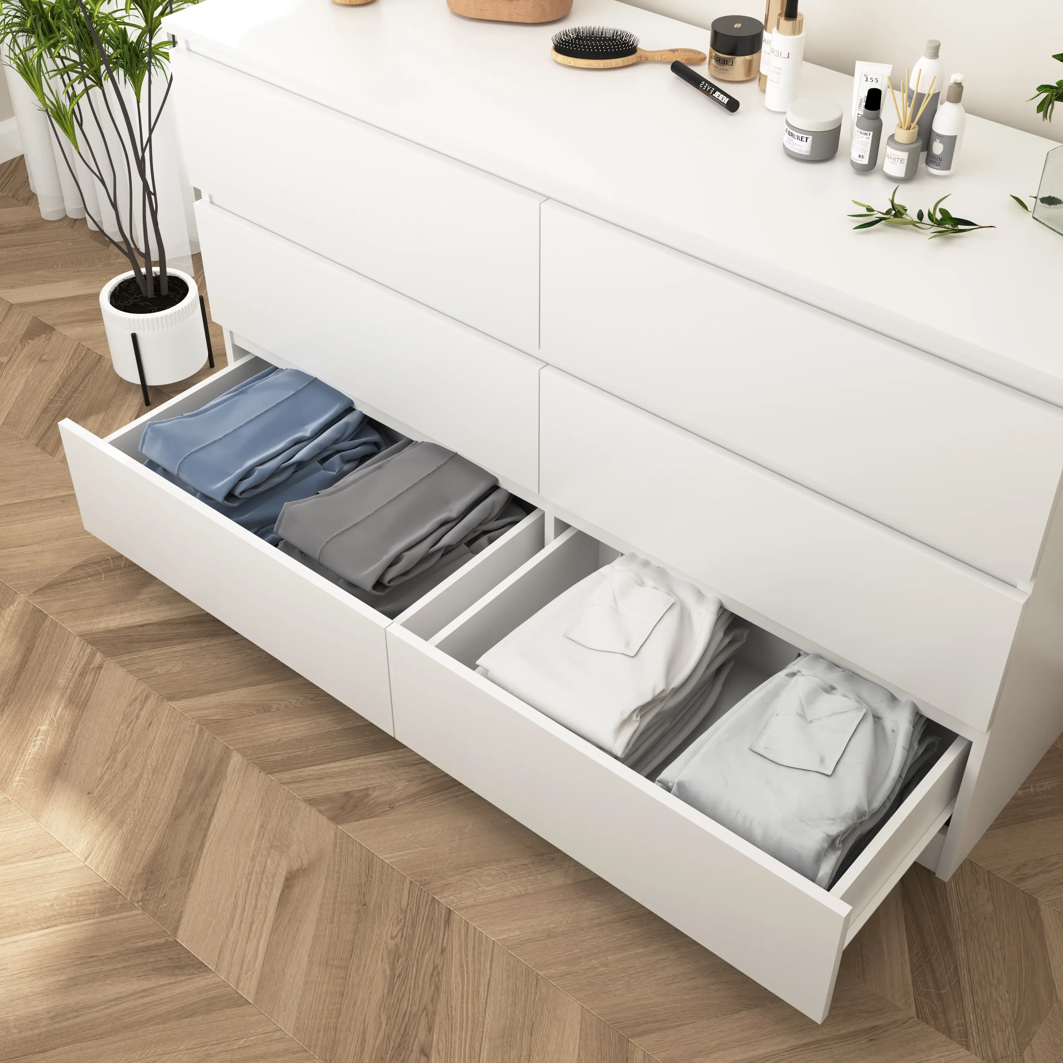 ·Minimalism With smooth white dresser, handleless chute drawers, clear vertical and horizontal lines, and curved lines at the bottom, we will continue to create furniture that is extremely simple, high-quality, and in line with customers aesthetics.