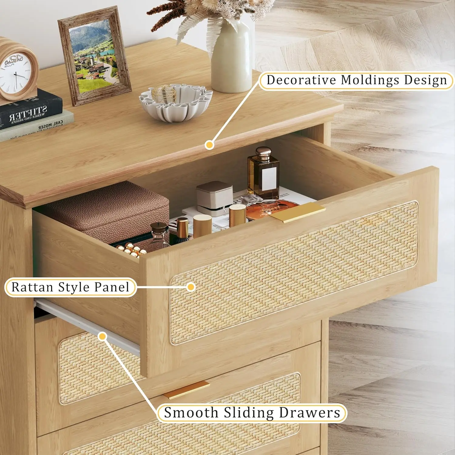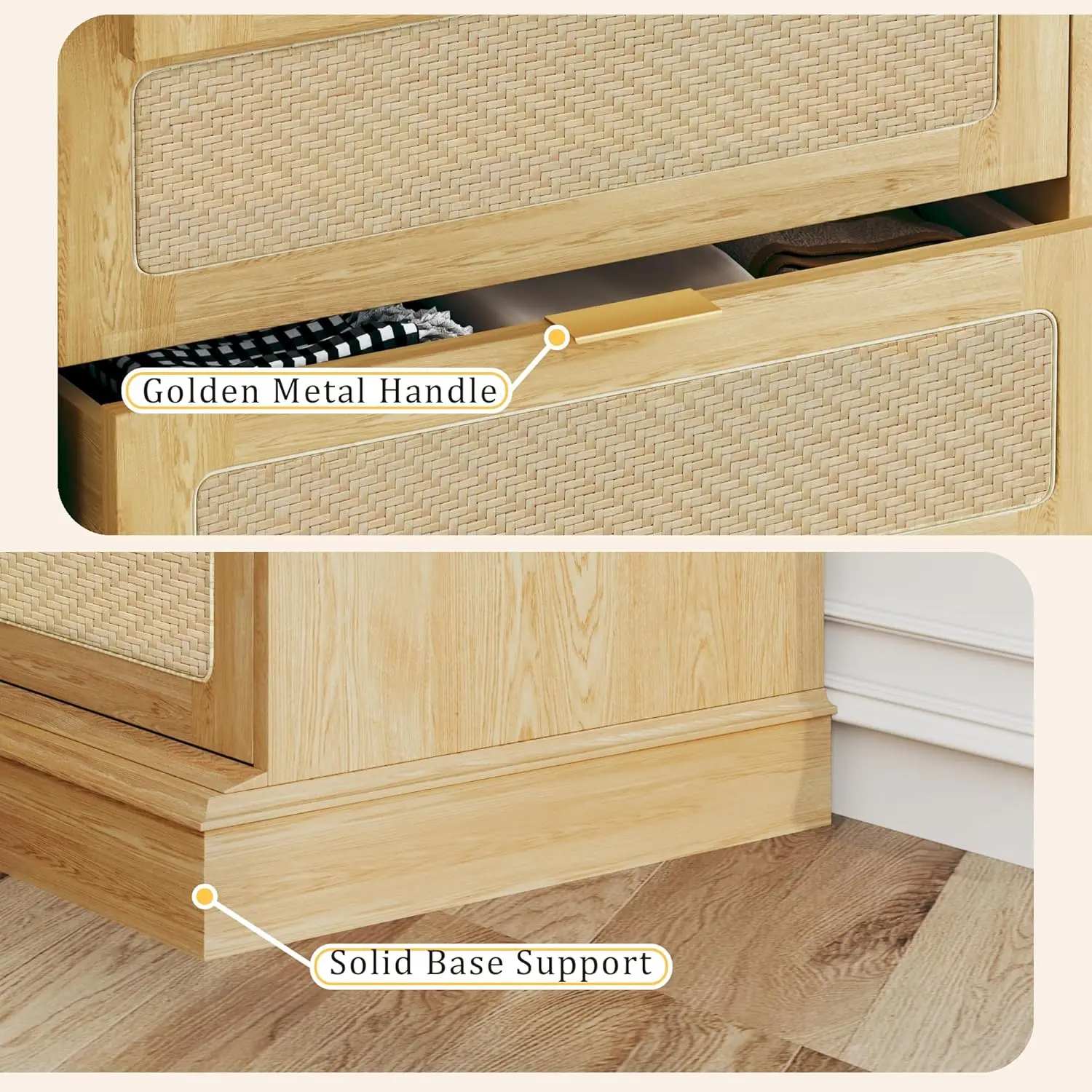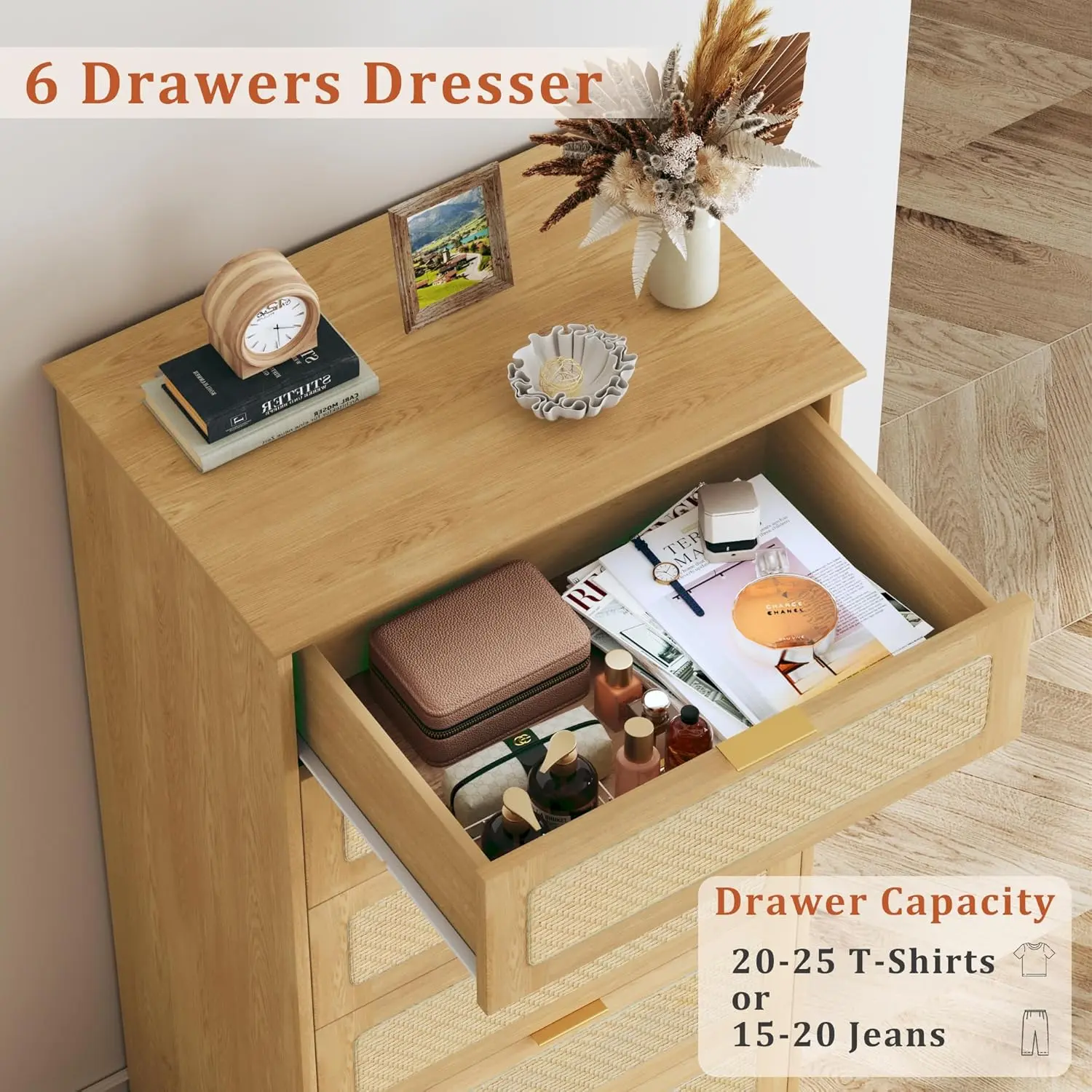 ·Boho-Inspired Design:This tall dresser combines clean modern lines with handcrafted woven rattan drawer fronts, bringing a warm, breezy boho vibe to your space. The natural wood tone and subtle texture make it a stylish focal point for any room.