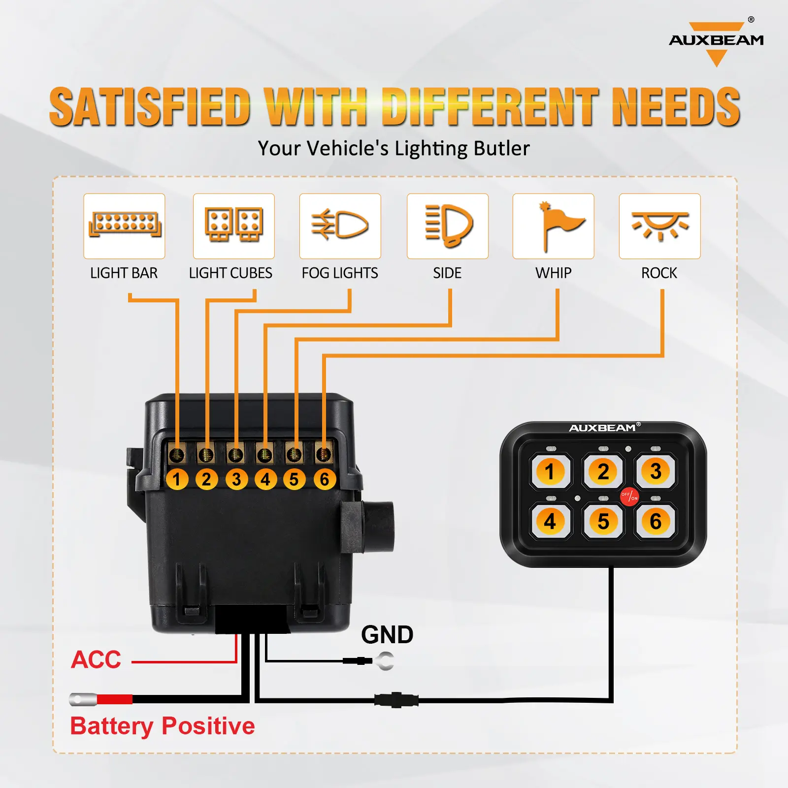 Universal 6 switch panel relay system. Power up to 6 lights or accessories from one convenient place.