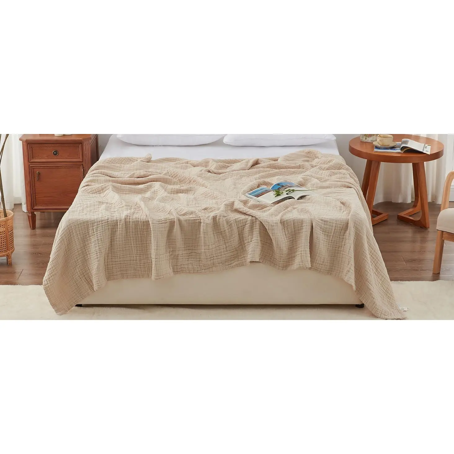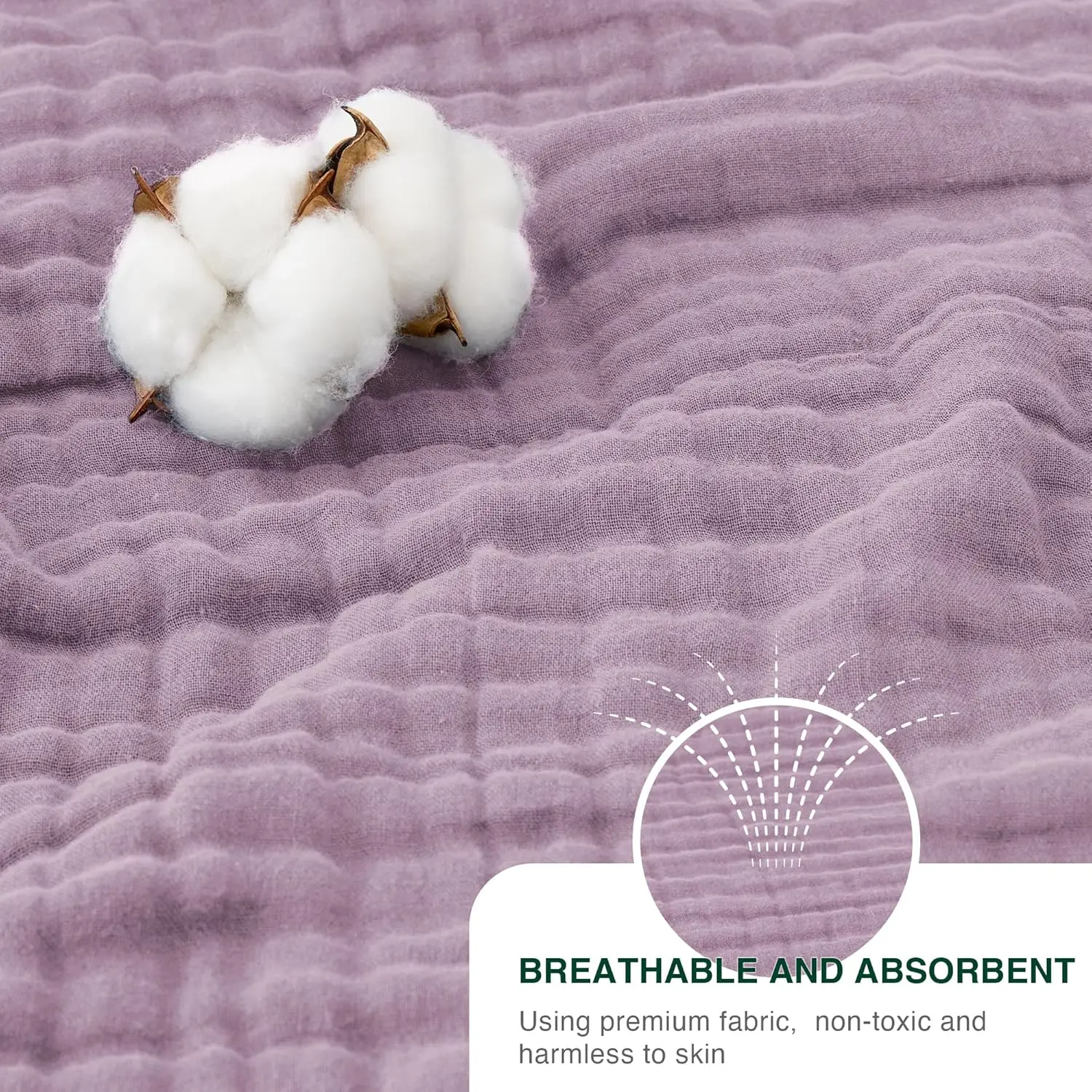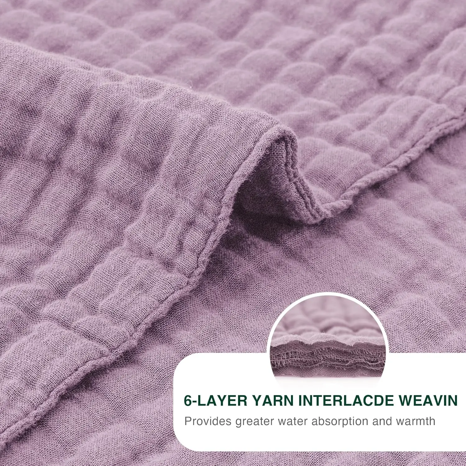 Breathable and Soft - Our muslin blanket is made of 100% cotton, the soft blanket is extremely breathable and moisture wicking and is gentle on sensitive skin, promoting a deep and restful sleep while preventing overheating.Lightweight and Warm - Our 6 layer cotton muslin blanket is super soft and lightweight.Thicker than others on the market, it keeps you warm without adding too much weight.This muslin blanket can be used in any season and is an essential bedding for everyday life.Suitable for Multiple Scenarios - Our cotton gauze blankets are suitable for adults, children and babies.You can use our blankets as travel blankets, bath towels, toddler blankets, and crib blankets.This muslin blanket will keep you cozy and comfortable while watching a movie or reading your favorite book or napping on the couch or bed.Multiple Color Options - We offer cotton blankets in a variety of colors to better match your bedroom, living room or personal style, including blue-gray, white and beige.This blanket is manufactured without the use of harsh chemicals, making it safe for you and the environment to use.Easy to Care - Please wash it separately in cold water using mild detergent.Tumble dry on low setting and no bleach.Please note that due to the design of the bubbles, the muslin blanket will be softer and full of elasticity after washed and dried, and the actual size of the product may deviate a little from the size we labeled.If you are not satisfied with the item you received, please feel free to contact us, we will reply to you within 24 hours.