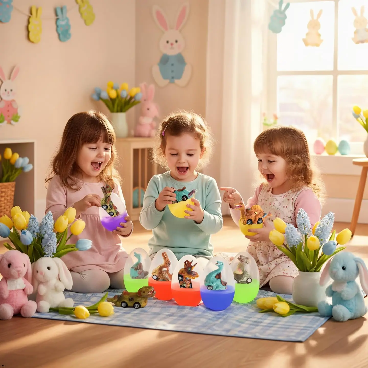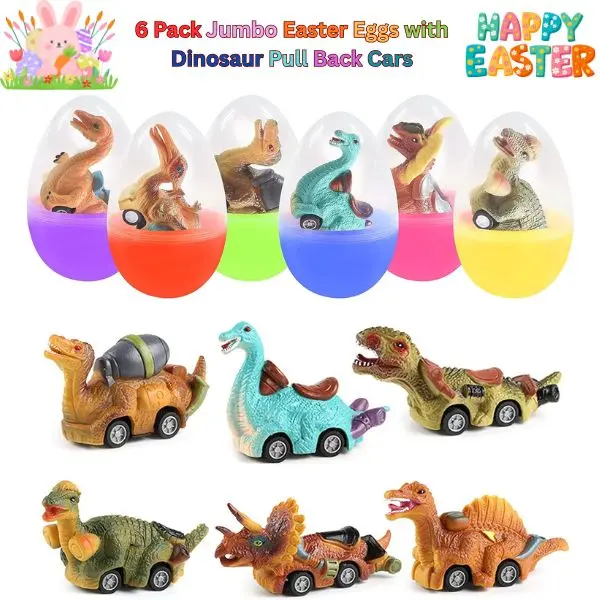 • 6 Pack Jumbo Easter Eggs: These eggs are perfect for kids, boys, and toddlers. They come with dinosaur pull-back cars, making them fun toys. 🚗