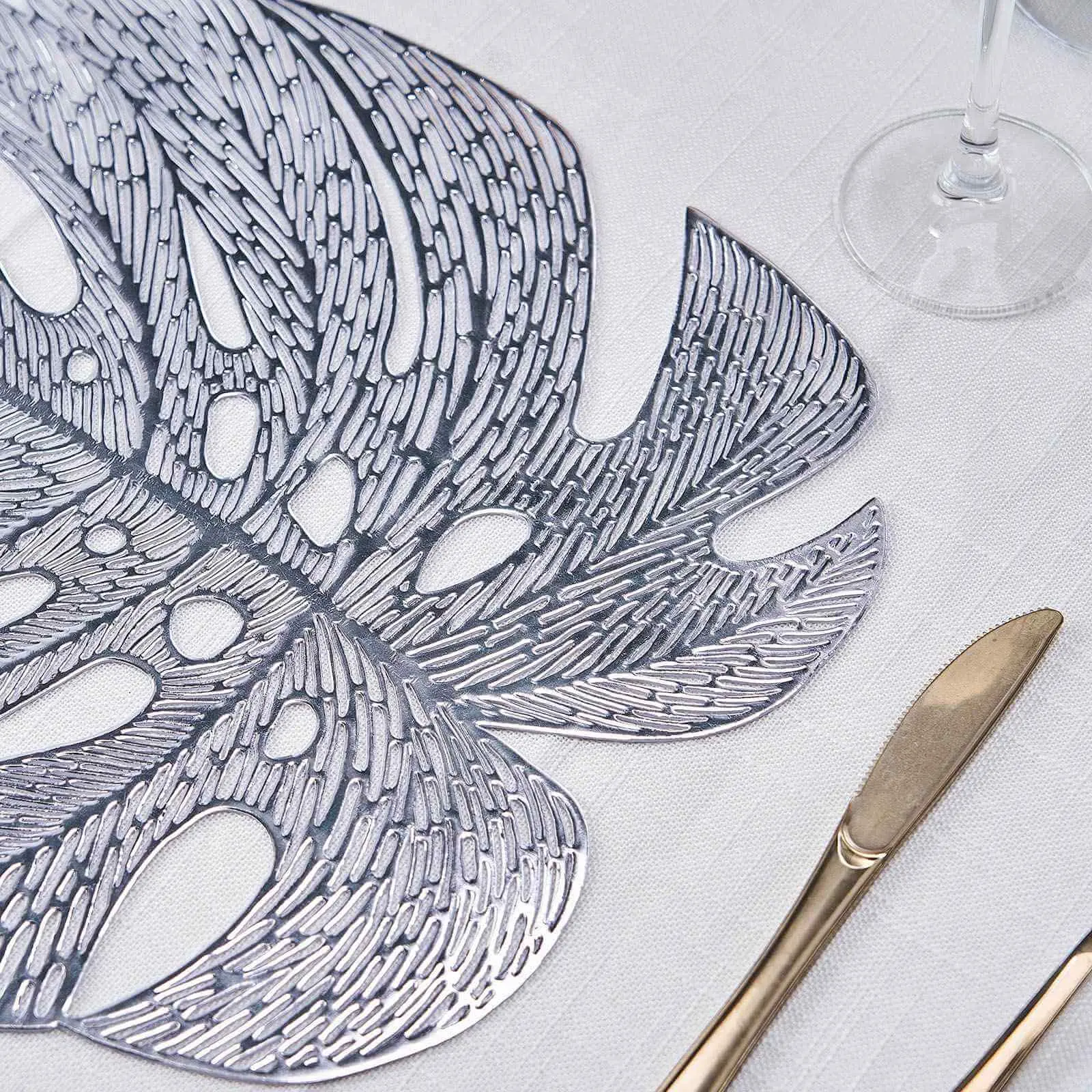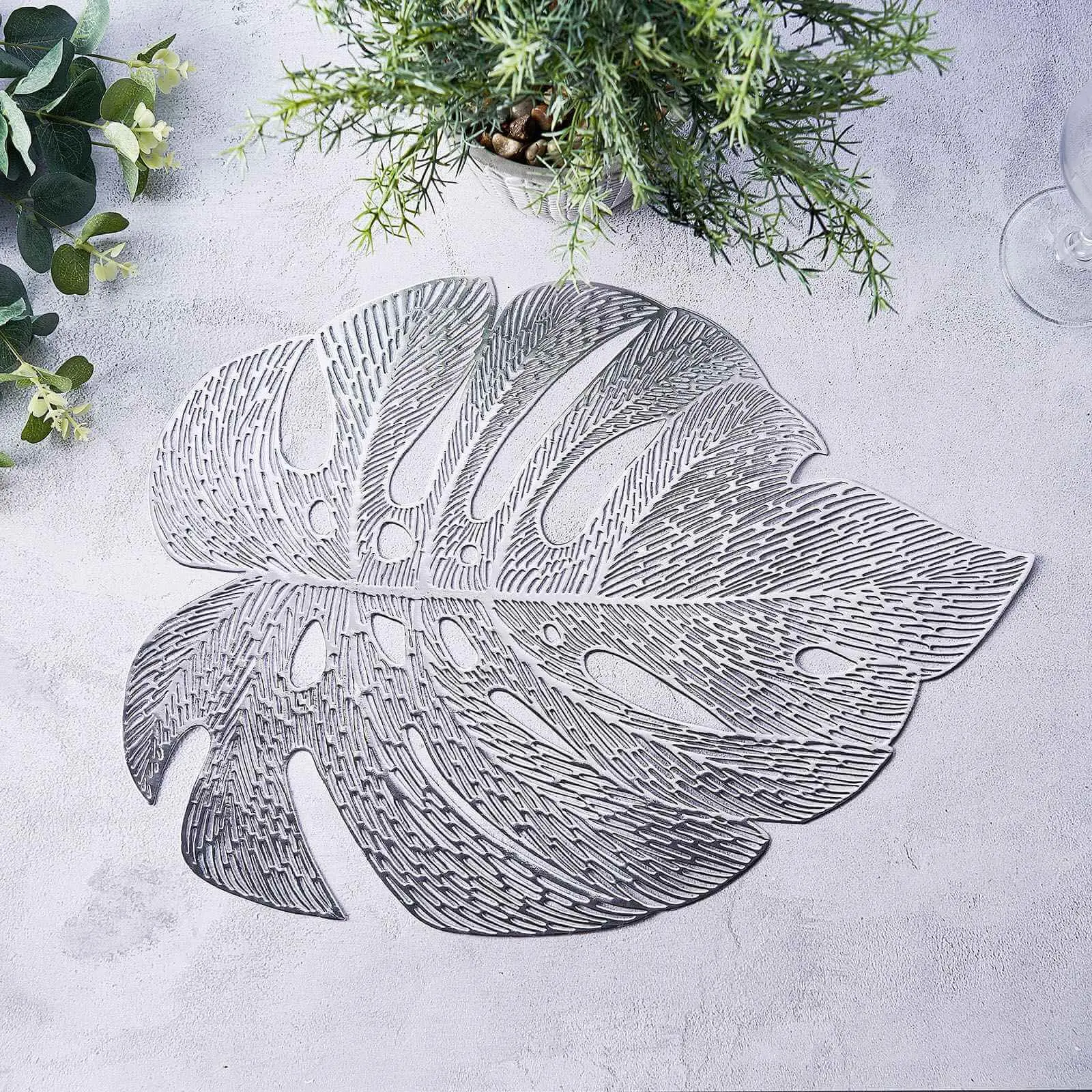 5. 6-Pack Vinyl Dining Table Mats 18" Monstera Leaf Design Silver - Non-Slip Placemats