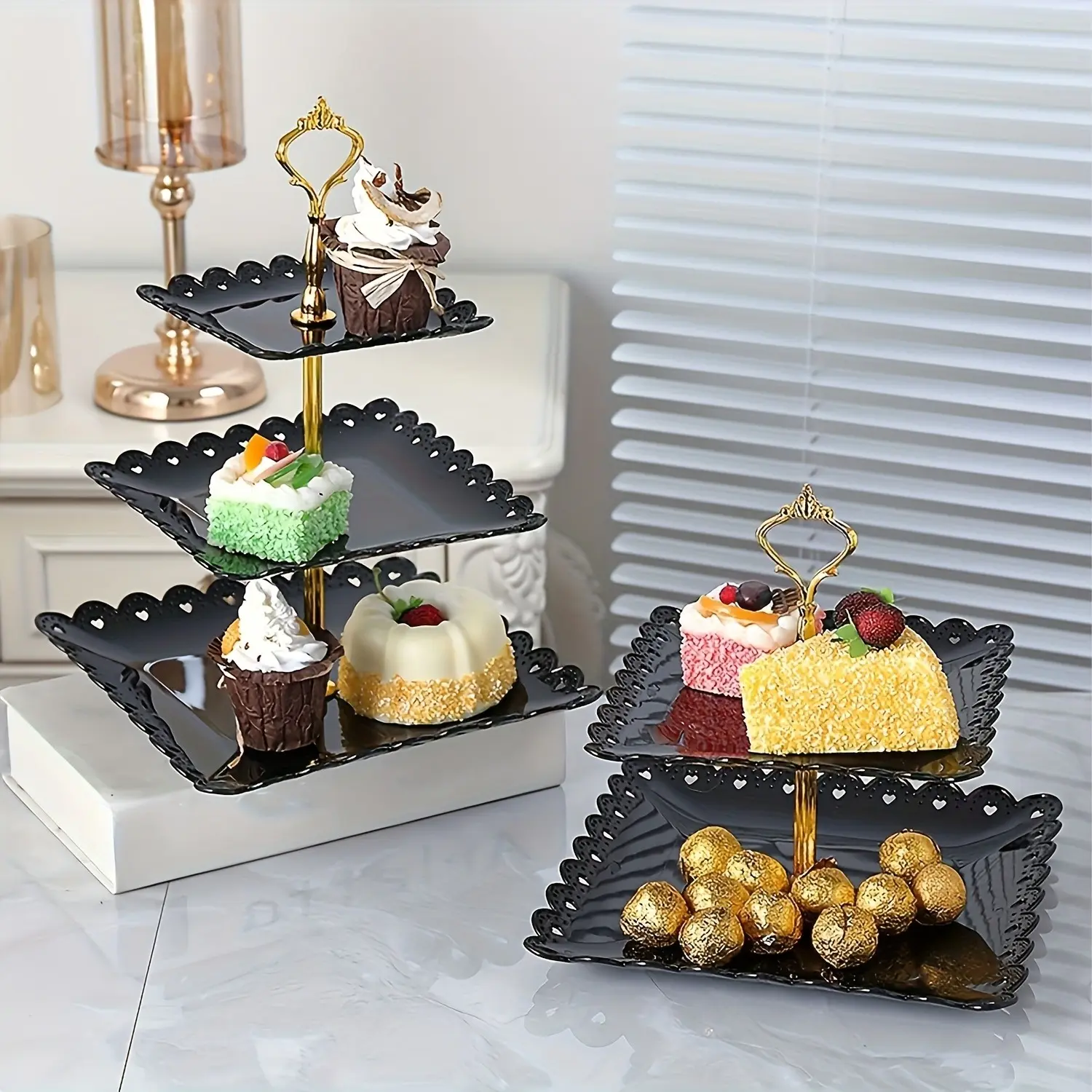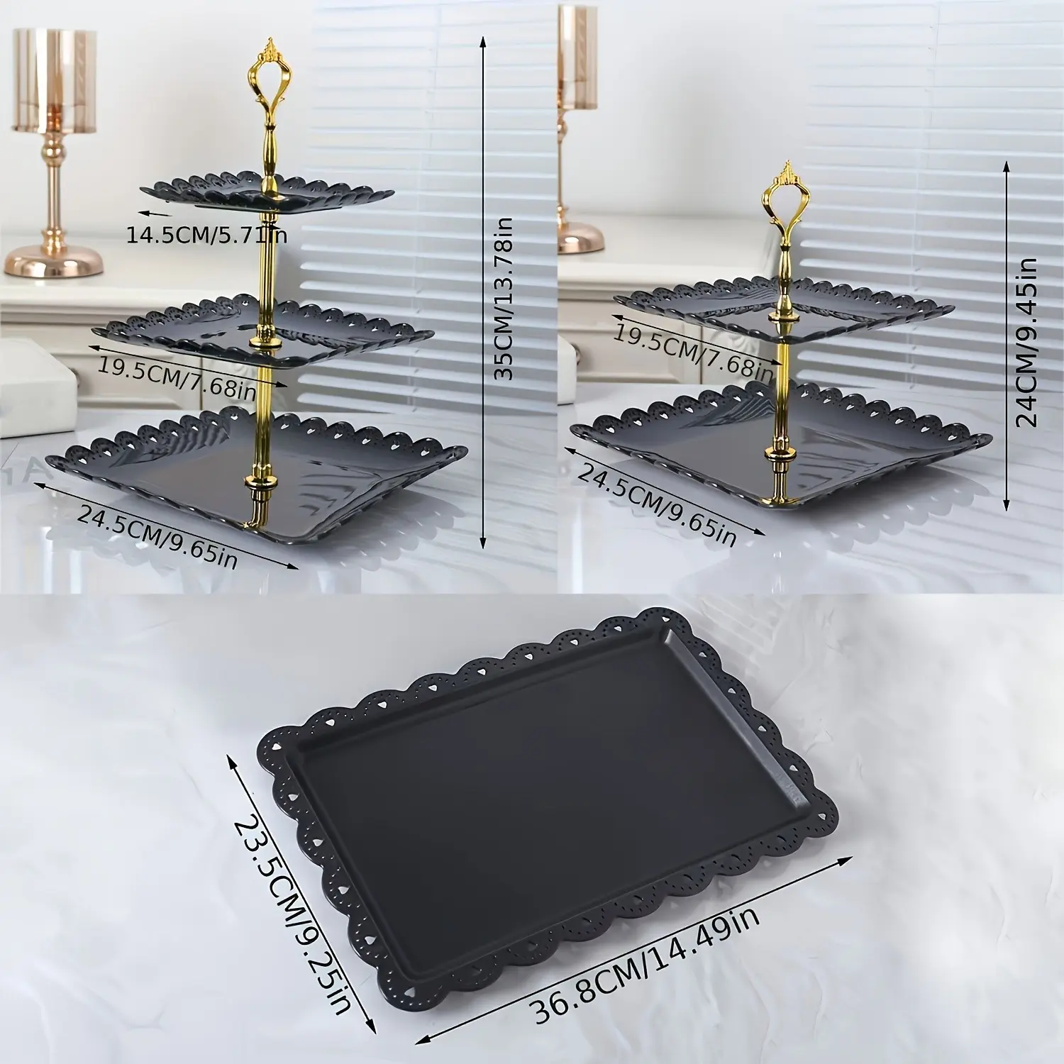 6-in-1 Cake Stand Set: This complete set of cake stands includes 2 rectangular trays, 1 double-tier round cake stand, 1 three-tier round cake stand, 1 double-tier square cake stand, and 1 three-tier square cake stand. Whether you are hosting a tea party, wedding, birthday party, or baby shower, these cake stands give you a variety of options to perfectly display cupcakes, cookies, muffins, and more. Safe and Reusable Materials: Made of food-grade PP plastic, these cake stands are not only safe for direct contact with food, but also reusable, making them an eco-friendly choice for your party. You can rest assured that your desserts will be placed on materials that meet safety standards. Sturdy and Stable Design: The cake stand features a large base plate for enhanced stability, ensuring that your desserts are safely displayed. Thickened support rods further increase the load-bearing capacity, providing a reliable platform for your dessert creations. Easy to Assemble: These cupcake stands are designed to be convenient and can be easily assembled without the need for additional tools. These convenient cake stands simplify the display process, allowing you to spend less time setting up and more time enjoying your event. ELEGANT PRESENTATION: These stylish cake stands enhance the beauty of your event and add a touch of sophistication to any occasion. Whether you are displaying a selection of gourmet treats at a formal or casual gathering, these cake stands are sure to impress your guests with their elegant design and practical functionality.