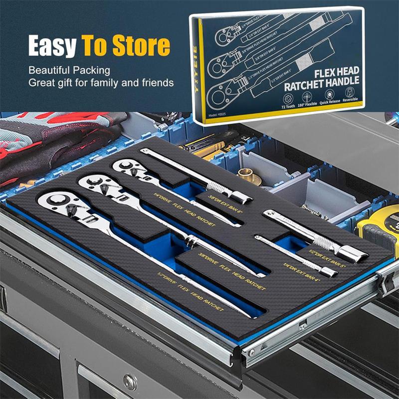 This 6-Piece Flex Head Ratchet Set includes 1/4", 1/2", and 3/8" drive flex head ratchet handles and extension bars. It provides extra leverage for twisting, making it easy to reach tight spaces and turn bolts. A great addition to your toolbox, ensuring you can handle various tasks efficiently.