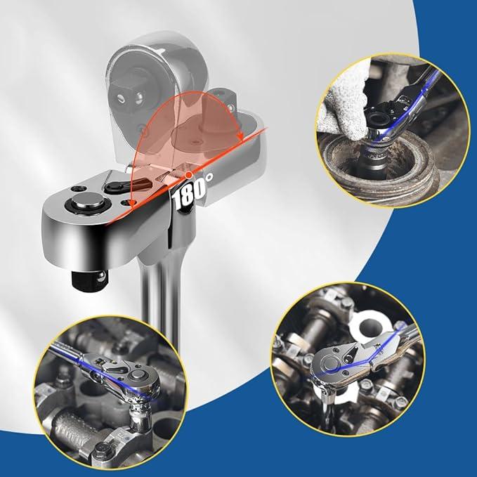 The adjustable ratchet head can flex 180 degrees, allowing operation from any angle without flapping. This swivel ratchet wrench makes it easier to get bolts tucked behind or under things. The reversible ratchet head allows for dual directions with ease, enhancing versatility.