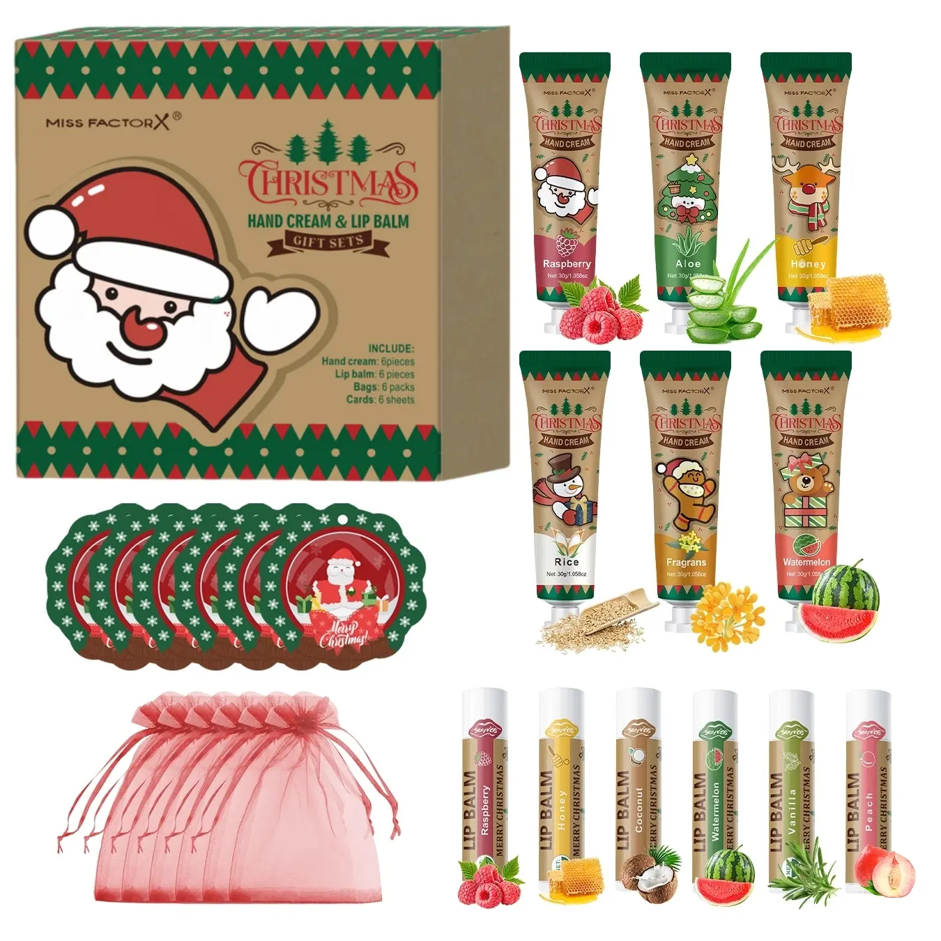 Christmas Gift Set, Hand Cream & Lip Balm, 6 Scents, Moisturizing, Includes Holiday Cards & Bags, Wedding Thank You Gifts, Valentine's Day