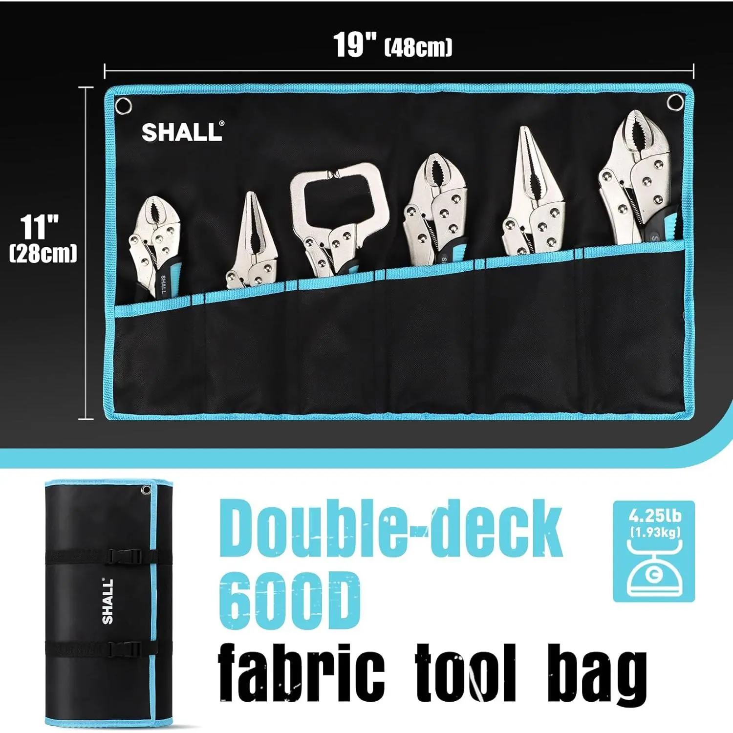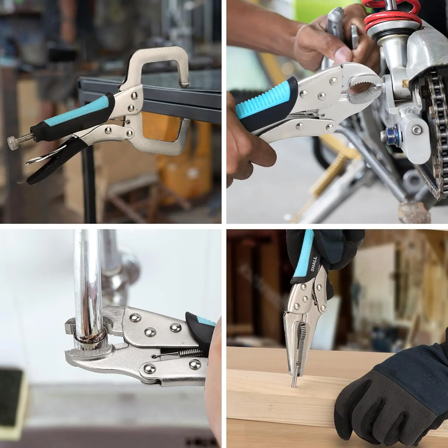 Complete Locking Pliers Set: Including 5", 7" & 10" curved jaw locking pliers (Max jaw capacity: 1-1/4", 1-1/2" & 2-1/8 "), 6-1/2" & 9-1/2" long nose locking pliers (Max jaw capacity: 2-1/8" & 4-1/16"), 6" locking c-clamp (Max jaw capacity: 2").Notice: Pliers’ surfaces covered with slushing oil for rust protection and it’s normal and harmless.Wipe these pliers before using then store them in a dry environmentAdjustable Tightening Screw & Quick Release Lever: Applicable for adjusting suitable jaw openings in order to deliver the clamping pressure for different projects.Able to close the jaw immediately for storingTwo-Color TPR Handle: Ergonomic design, providing non-grip and comfortable hand feel.lightweight and-saving, reducing hand fatigue.More efficient, operating with less effortRoll Up Storage Pouch: Made of black double-deck 600D fabric, featured with 6 pockets inside and buckle for organized storage.Easy to carry, compact and save storing space in storeroomMultiple Use: Used to loosen frozen nuts and bolts (curved jaw locking pliers), clamp narrow materials and grip and other small fasteners (long nose locking pliers), grip tapered or thin materials, join edges to ends in face frames, and reach around rolled edges, I-beam lips, angle iron bends, and other barriers (locking c-clamp)