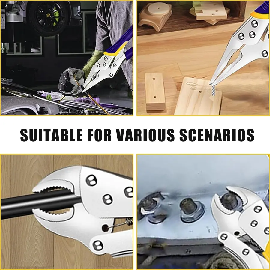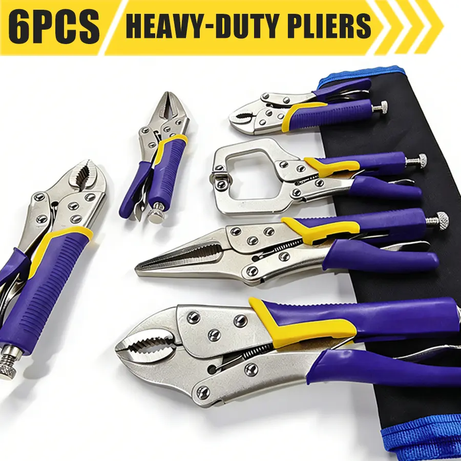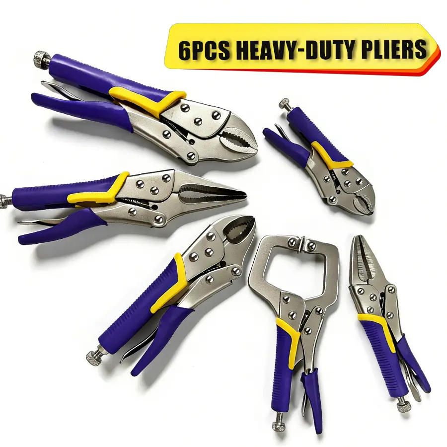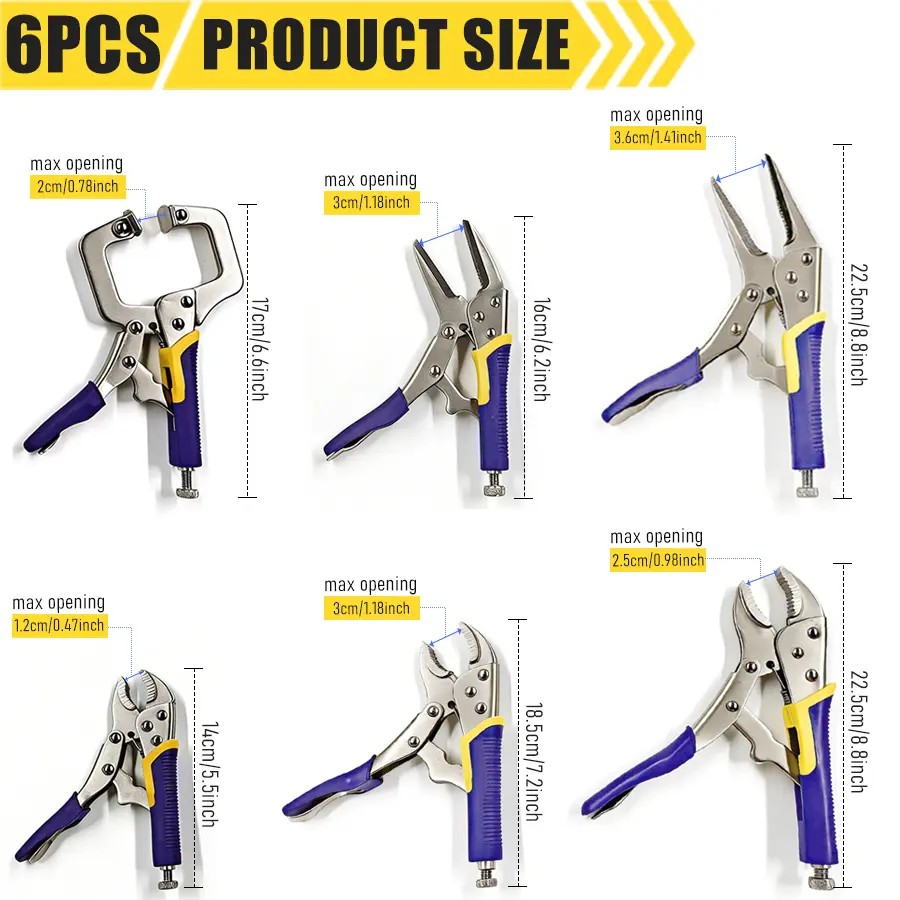 ✨ 6-Piece Locking Pliers Set includes various sizes for versatile use. Features 5", 7", and 10" curved jaw pliers, plus 6-1/2" and 9-1/2" long nose pliers. The set also comes with a 6" locking C-clamp. Perfect for multiple tasks.