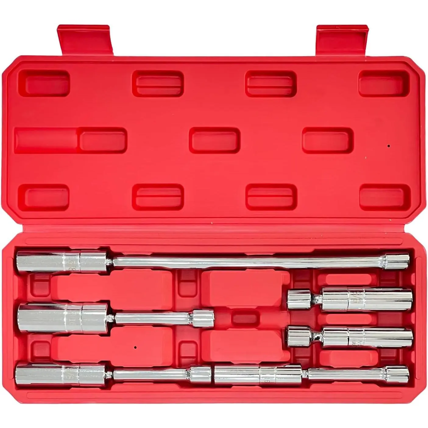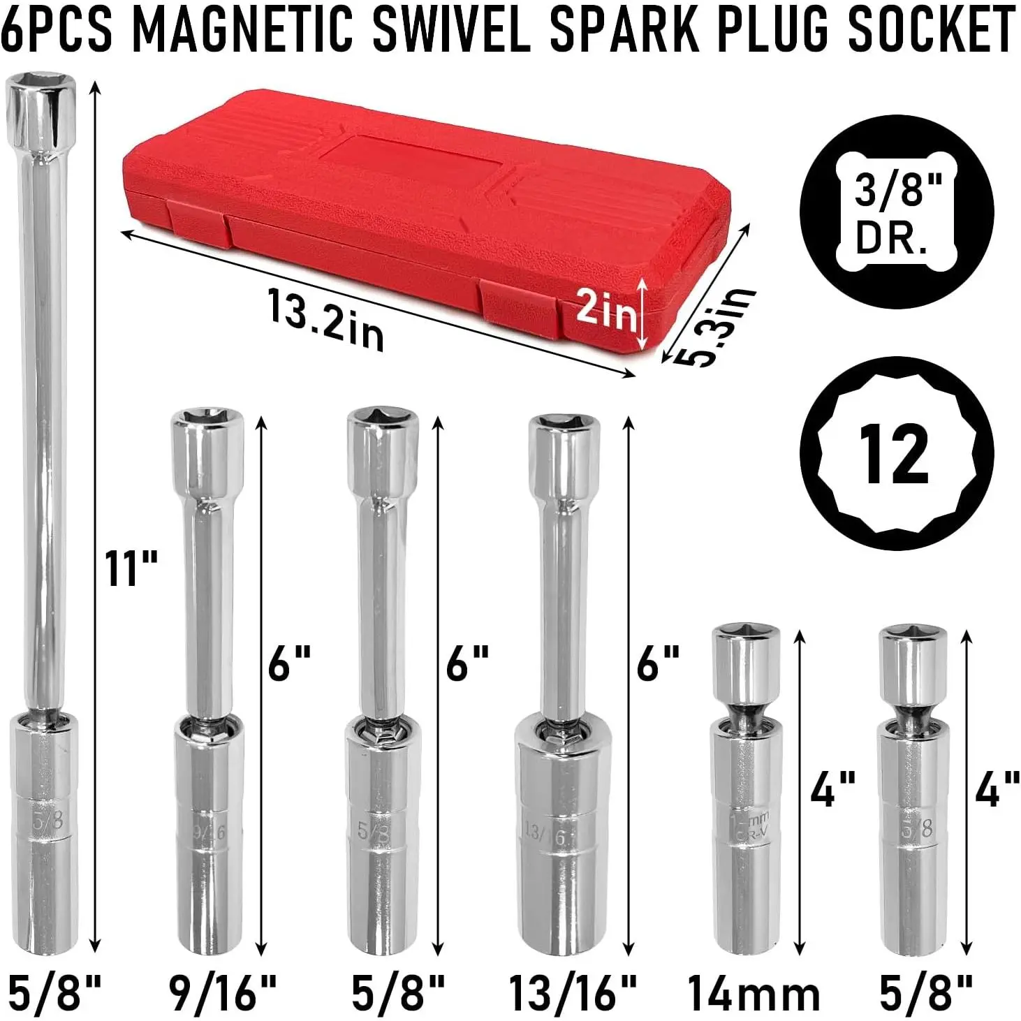[Comprehensive Set with Essential Sizes]This 6-piece set includes sockets in 14mm x 4", 5/8" x 4", 5/8" x 6", 5/8" x 11", 9/16" x 6", and 13/16" x 6" dimensions.Perfect for varied maintenance needs, these sockets fit most cars, trucks, motorcycles, and lawnmowers, covering a wide range of applications.