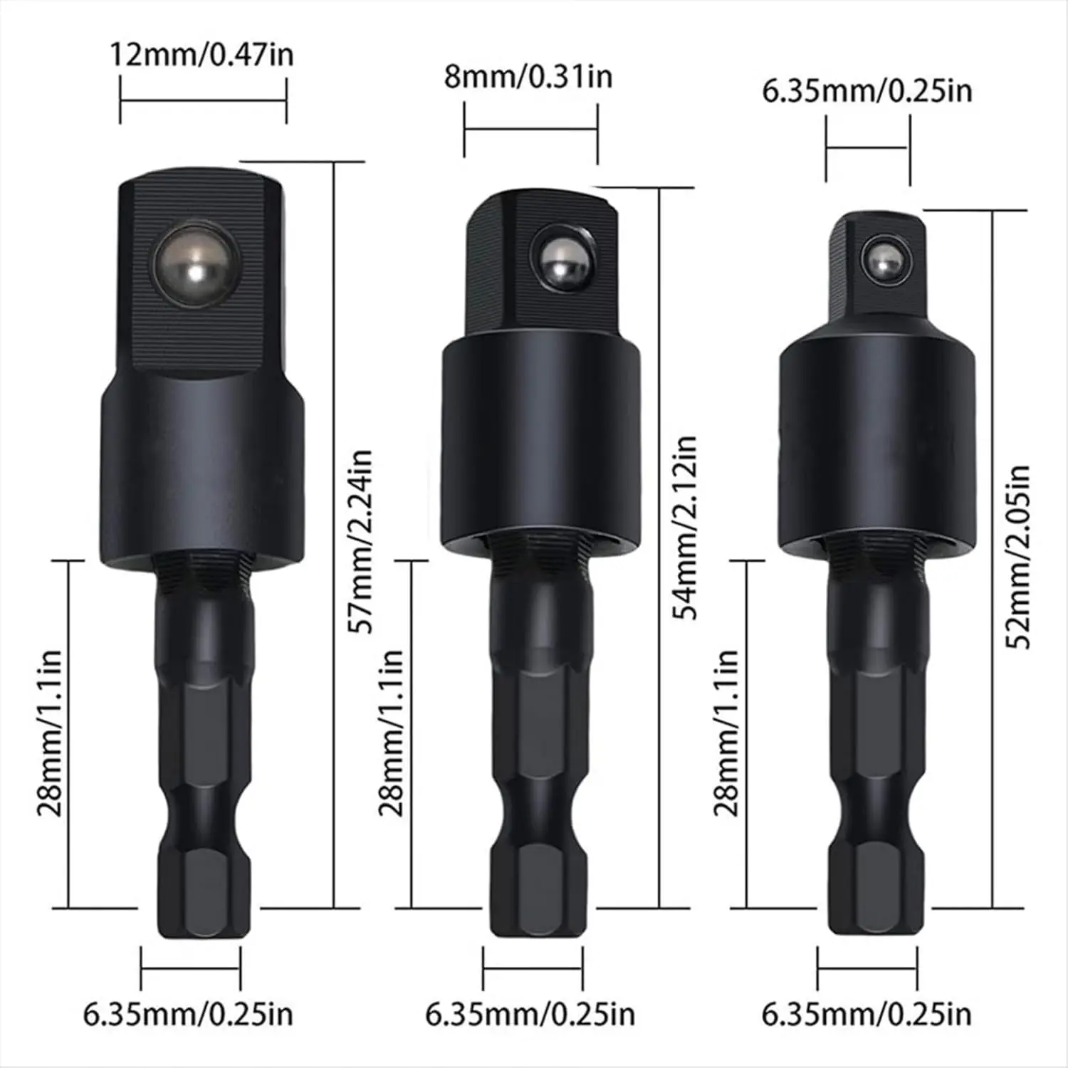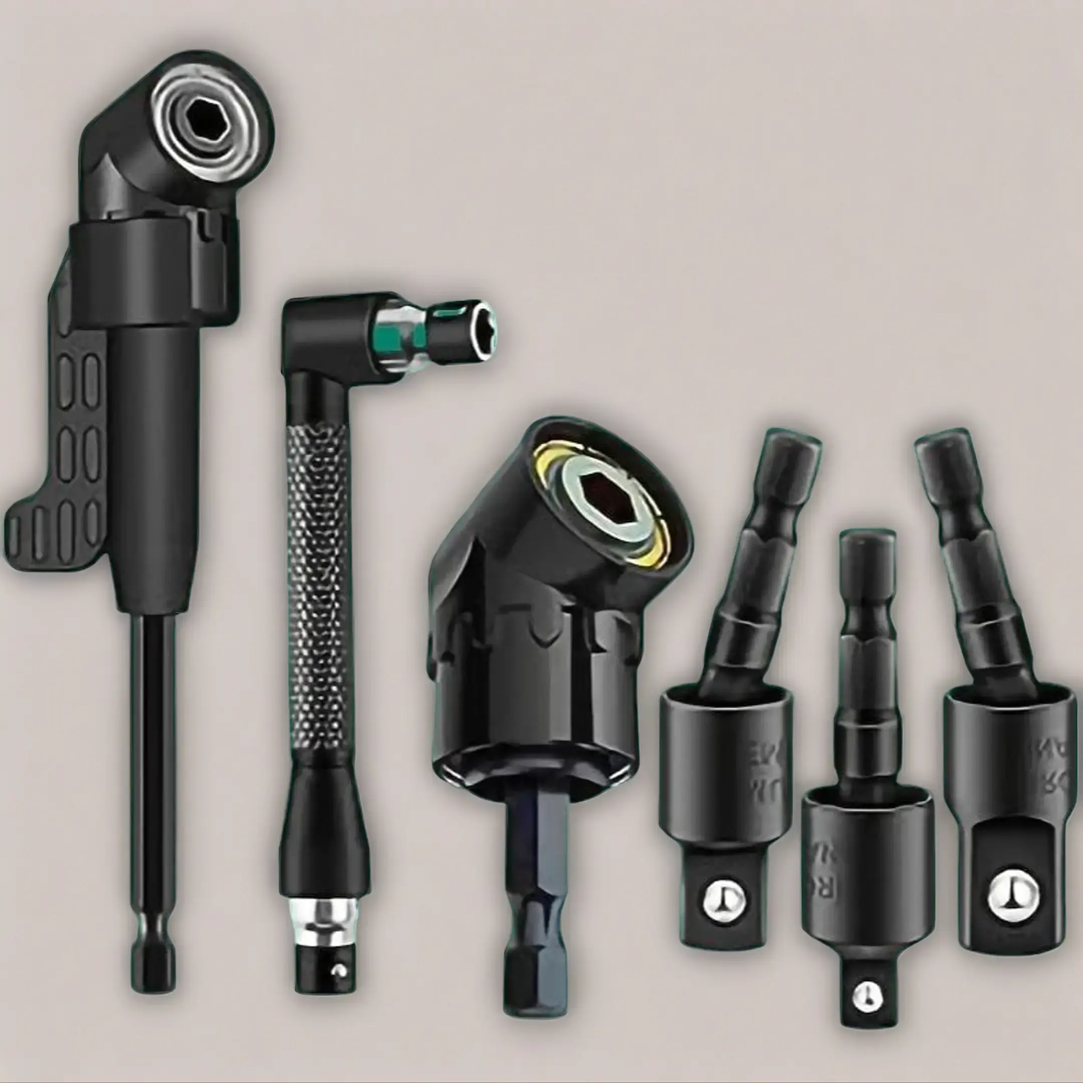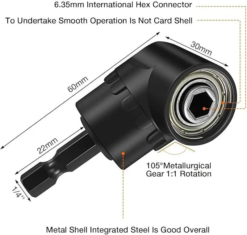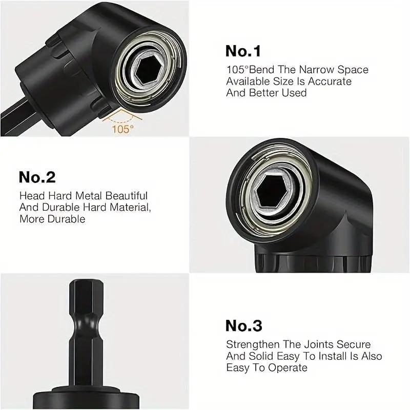 6-Piece Right-Angle Drill Attachment Set, Includes 3 360° Rotatable Socket Adapters, 2 Hex Shank Drill Adapters, 90° Beveled Drill Bits, Drill Tool