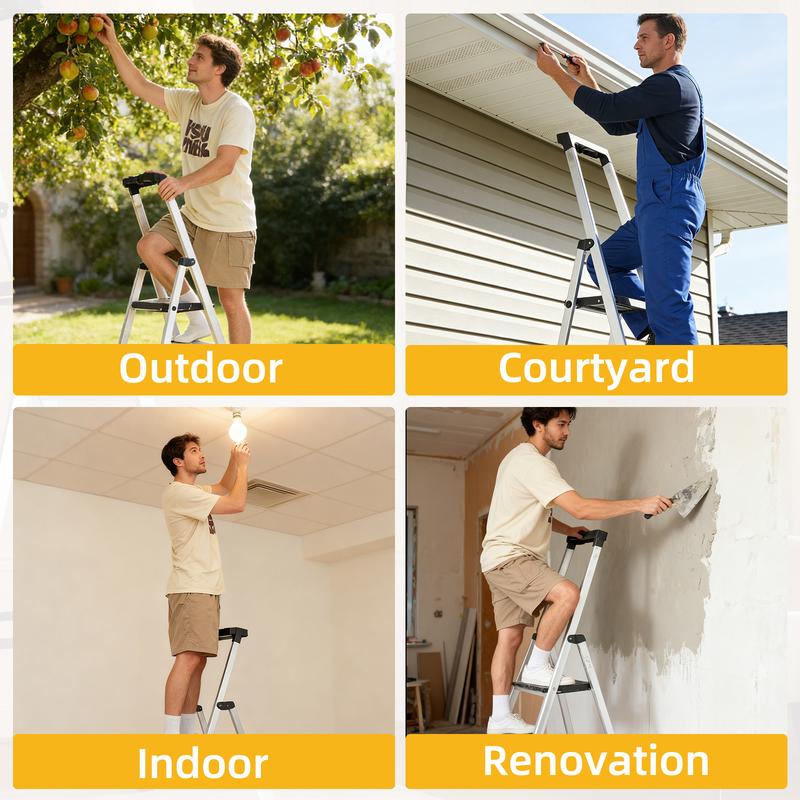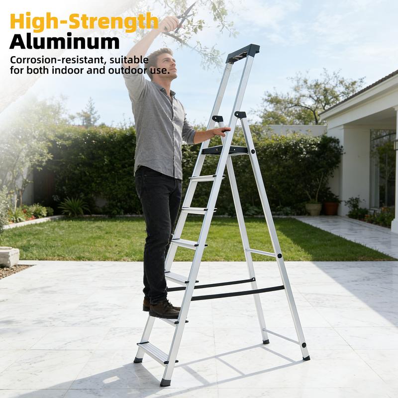 The MCQ Aluminum Folding Step Ladder is engineered for superior performance and safety. Built with a heavy-duty aluminum frame, it supports up to 330 lbs and features corrosion-resistant durability. Its innovative design includes non-slip rubber feet for ultimate stability and ribbed steps with a galvanized steel platform for secure footing. The spacious 25x25cm top tray conveniently holds tools and materials. With a slim-fold design for compact storage, this ladder is the reliable choice for a wide range of indoor and outdoor tasks, from painting to window cleaning.
