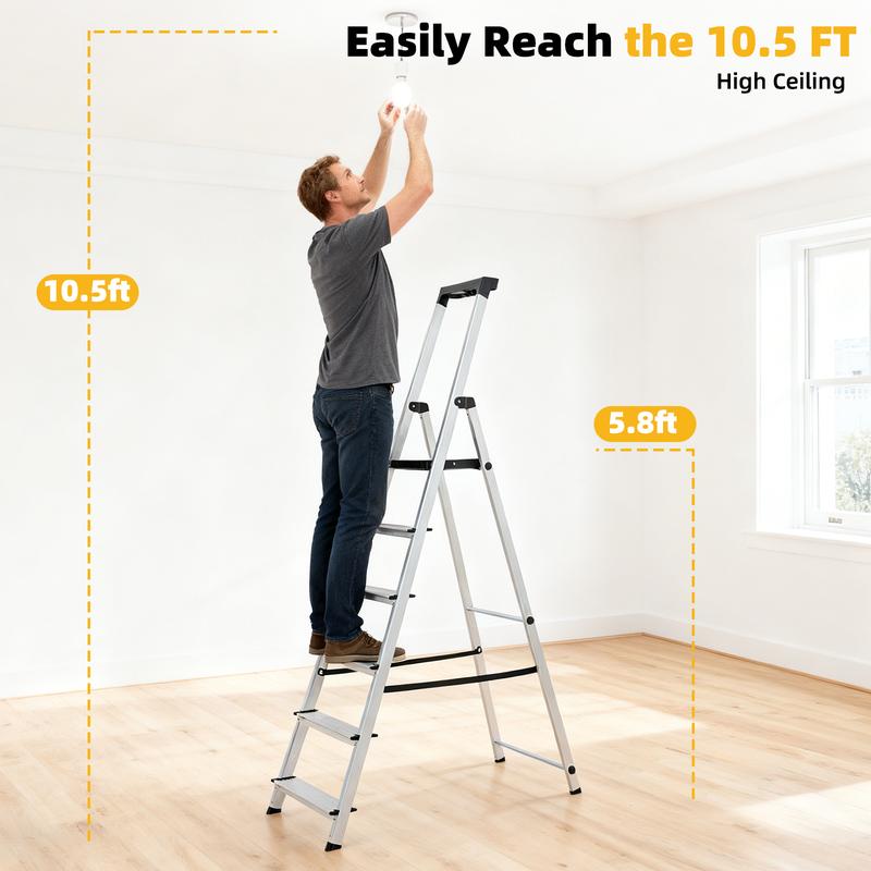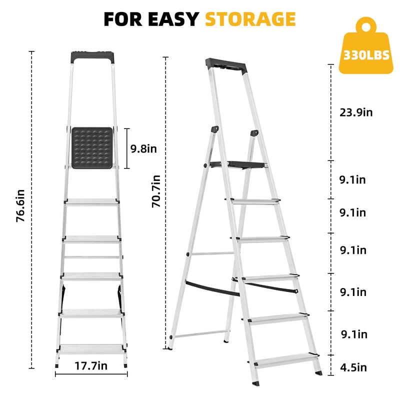 ·【Space-Saving Storage】- The innovative slim-fold design allows the ladder to collapse to a compact 4.6 inches thick, making it incredibly easy to store flat against a wall or in tight garage or closet spaces.