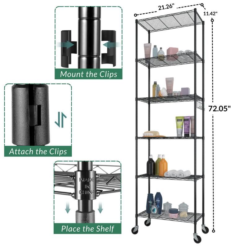 ·LARGE STORAGE STANDING SHELF: 6 layers of large storage space, which can effectively store items in a relatively small space.With industrial casters, which can better move the shelf to the appropriate position