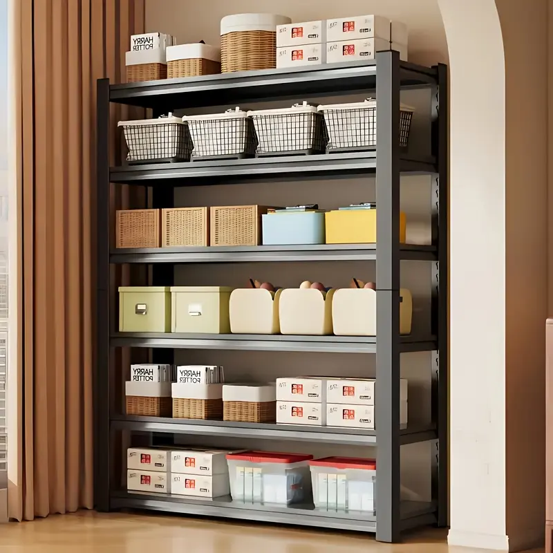 This six-level metal garage shelving unit can be quickly taken apart and put back together, allowing it to become two separate shelves: one with three levels and another with three levels.It's perfect for storing tools, office materials, or various other items, accommodating a wide range of storage requirements.When a one-level shelf isn't enough but a large multi-level shelf is too bulky, this option is perfect.A single shelf can separate snack areas from tool sections, effectively fulfilling a