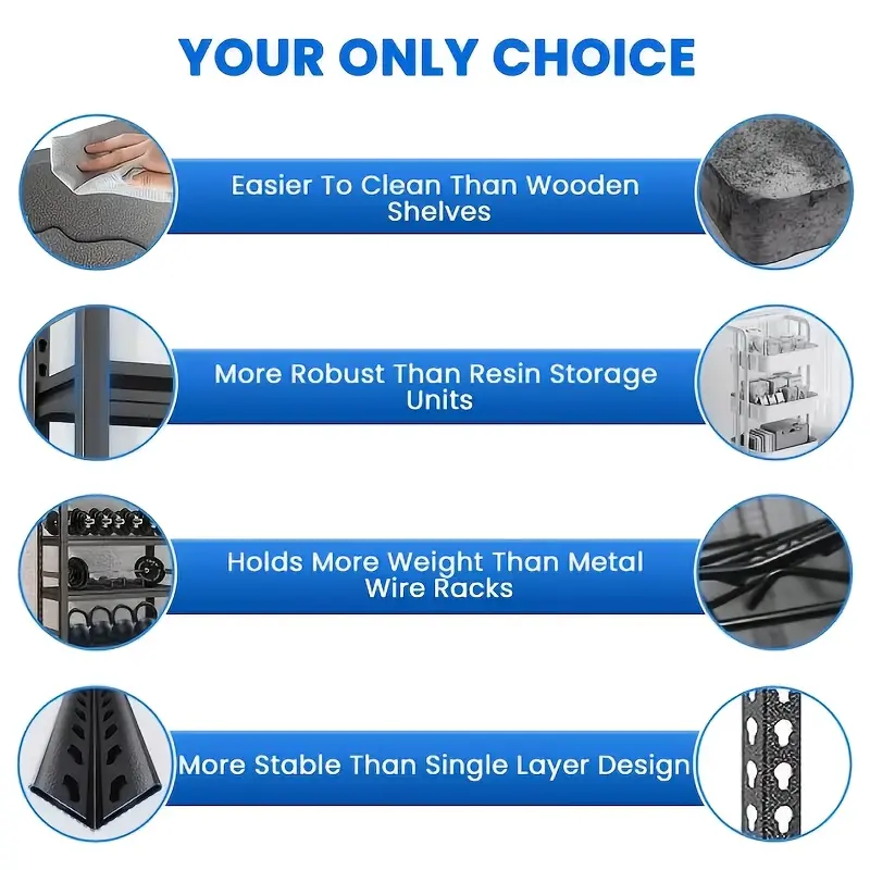 Rapid Setup: The intelligent interlocking mechanism enables swift installation without tools. Following the straightforward guidelines will help you save both time and energy while efficiently and securely arranging your robust metal shelving.