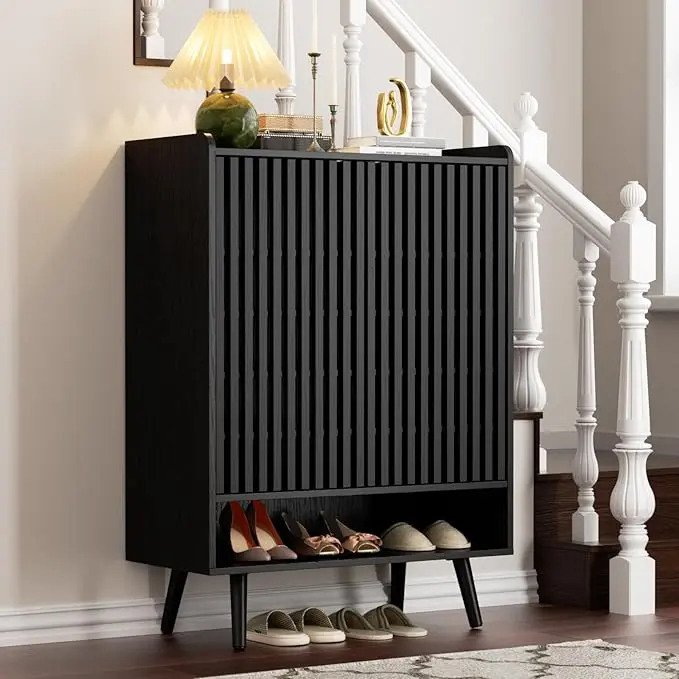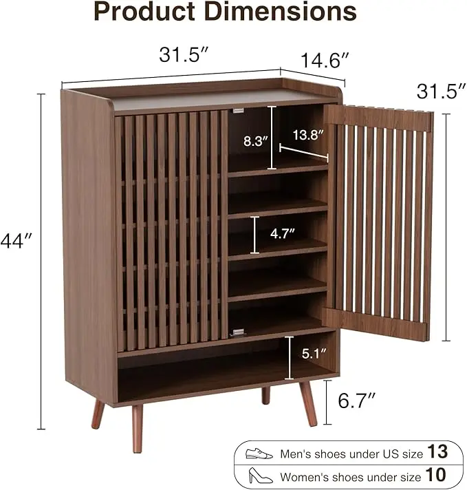 Generous Storage Capacity: At 31.5" W x 14.6" D x 44" H, this shoe cabinet offers ample space. The wide countertop holds keys and bags, while the open lower shelf is ideal for house shoes and robot vacuums. Inside, six shelves with adjustable partitions ensure optimal space utilization.