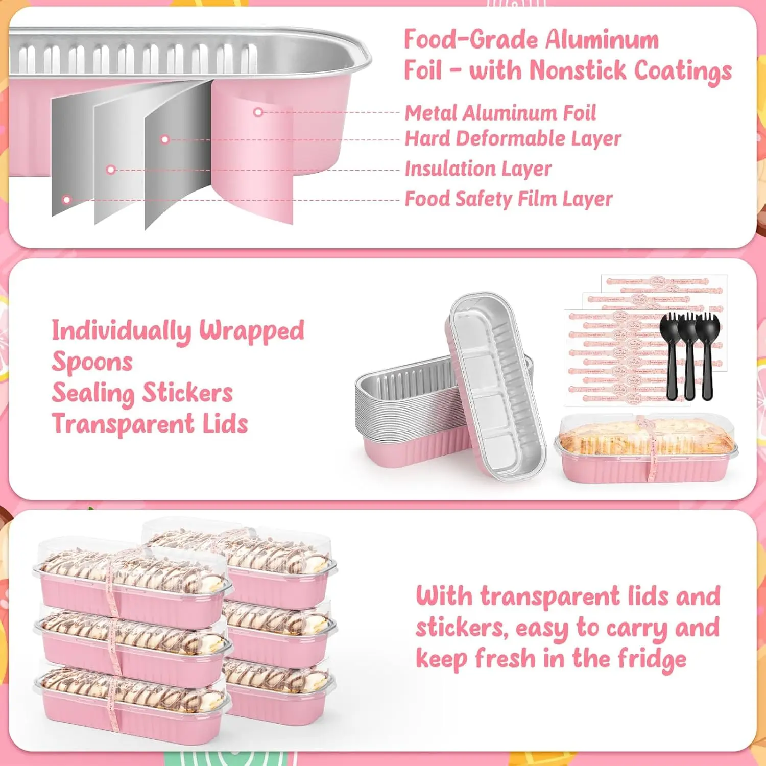 Value Pack: Come with 60 pack disposable mini loaf cake pans with 60 pack clear , 60 pack spoons and 60 count stickers. to fill with mini loaf, brownies, snacks and cakes for customers in kinds of parties
