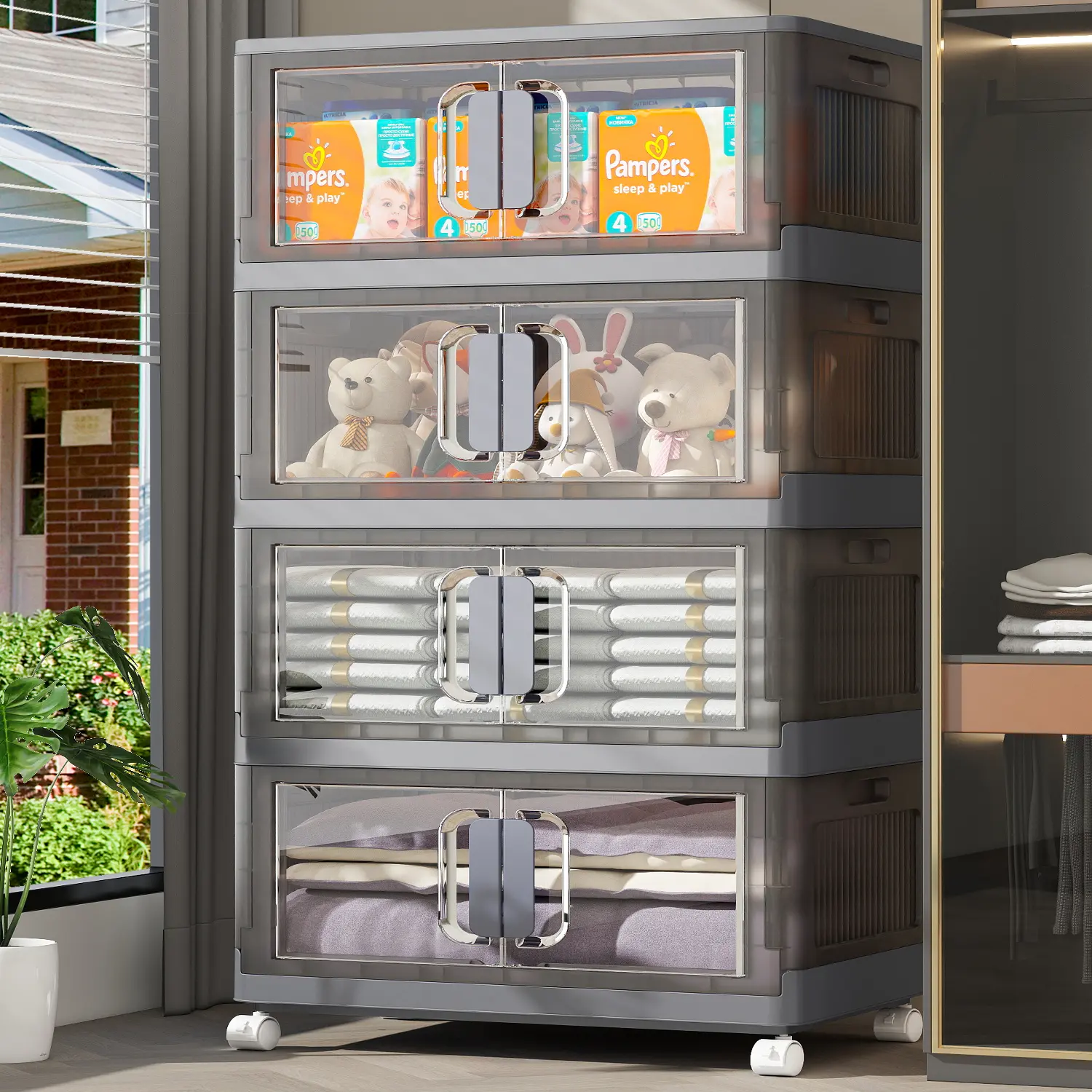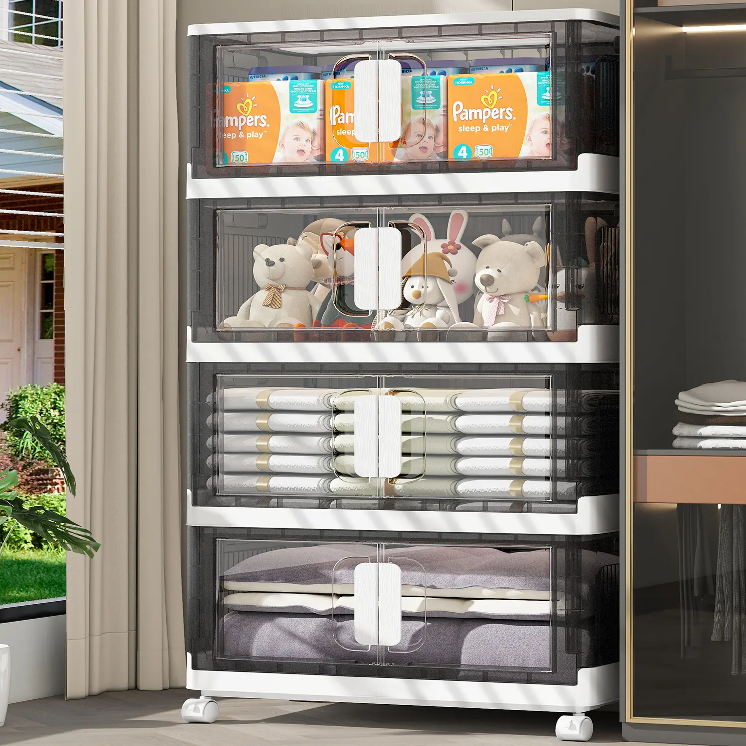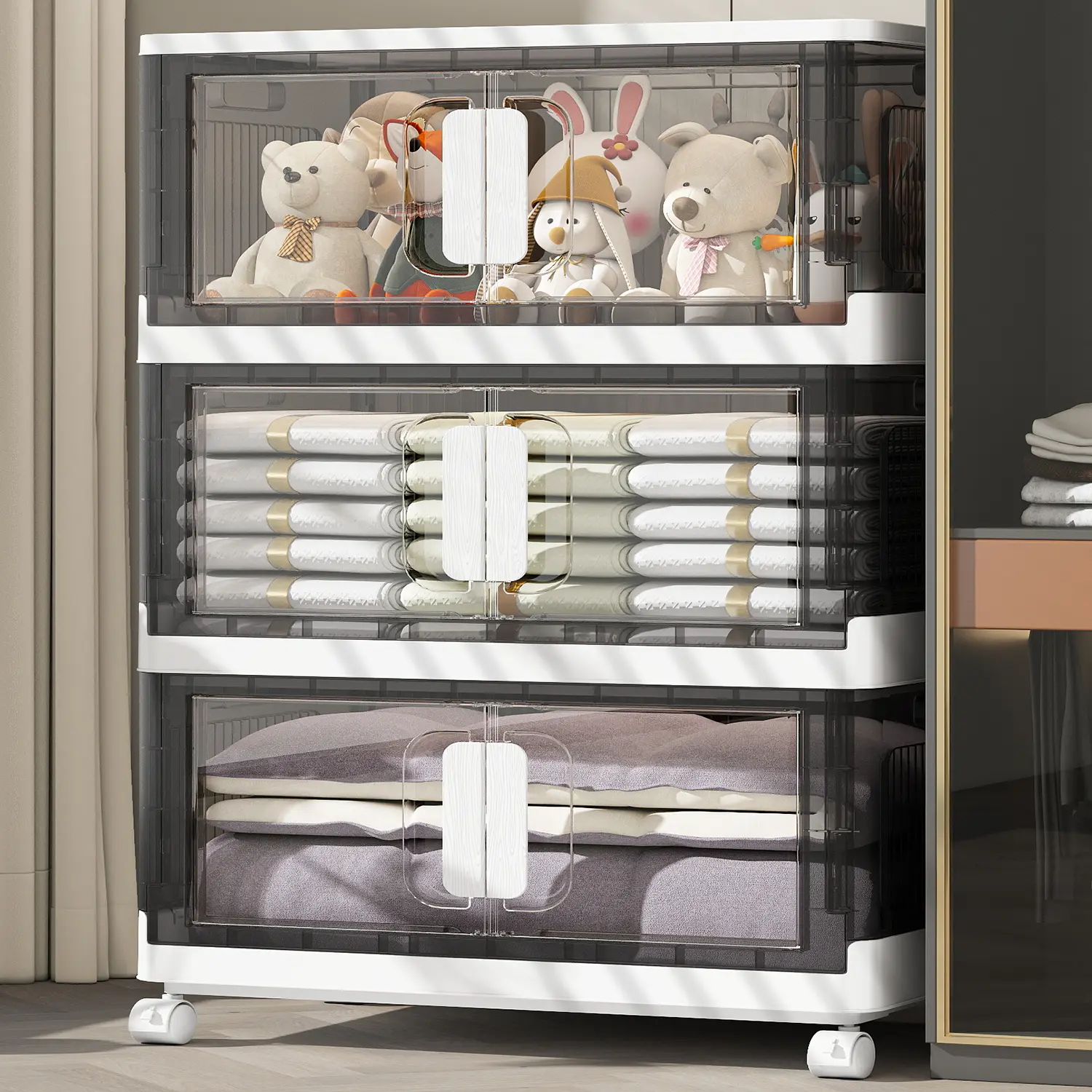 ·Clear front door allows quick access without removing stacked items. Easy to find and get what you need - perfect for everyday use in closets or children's rooms.