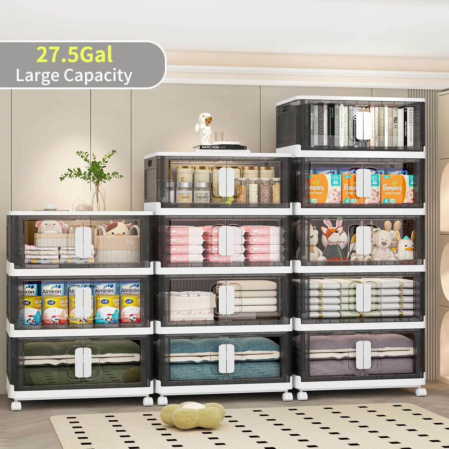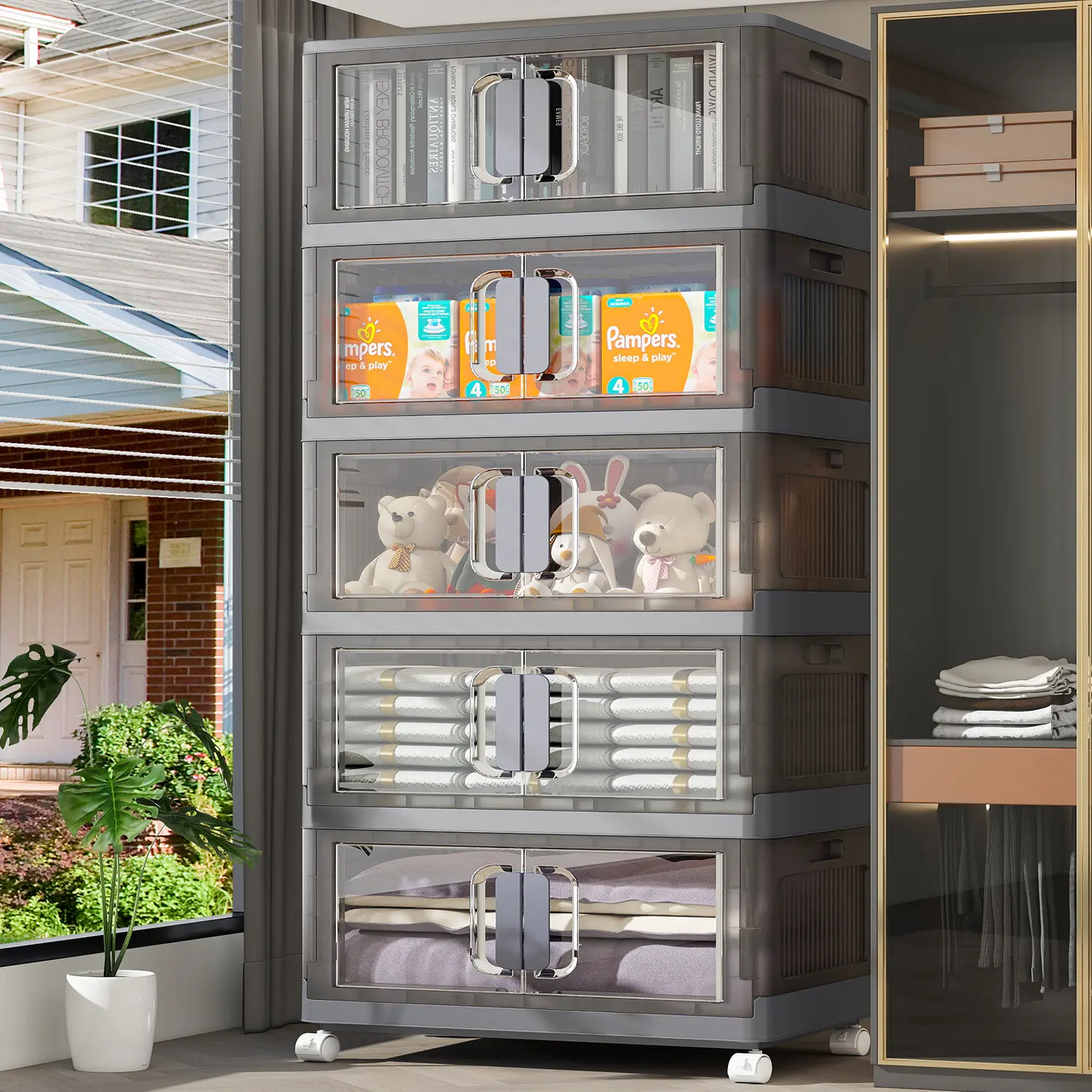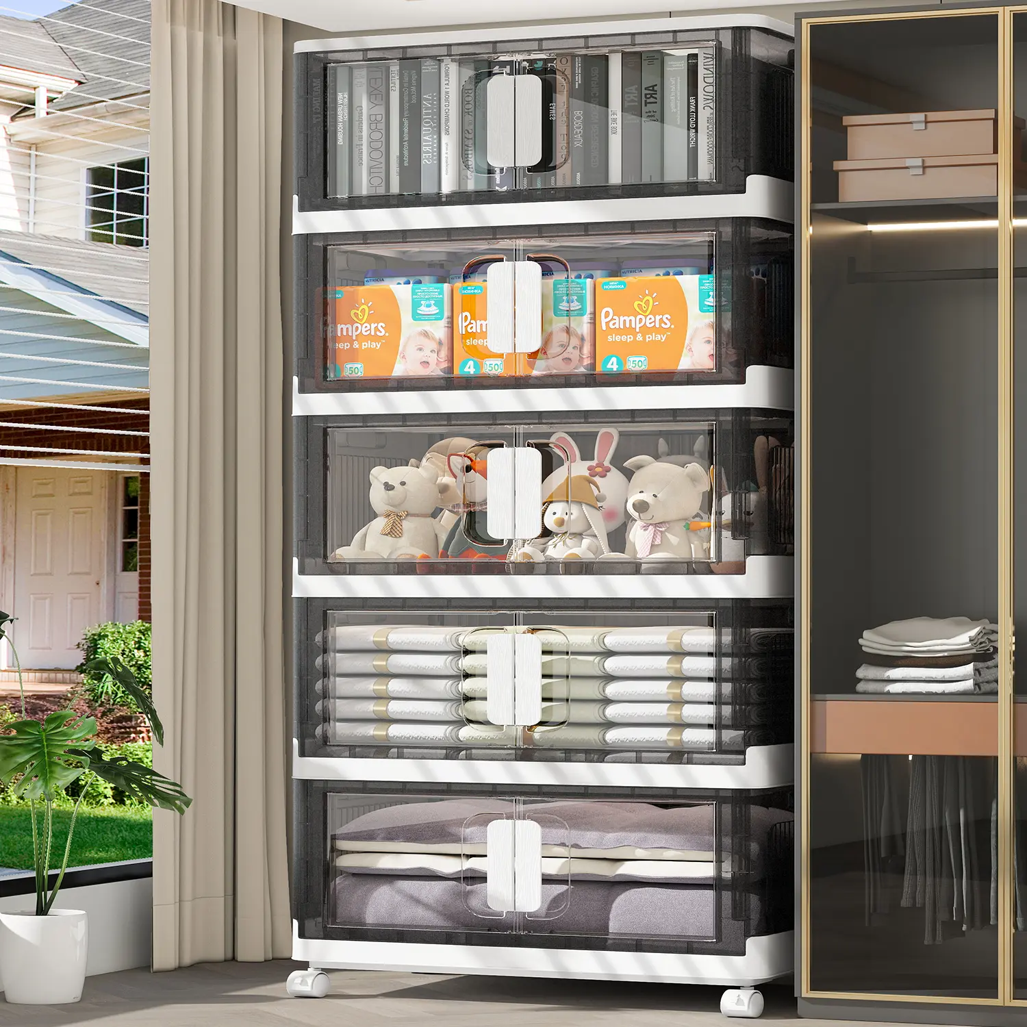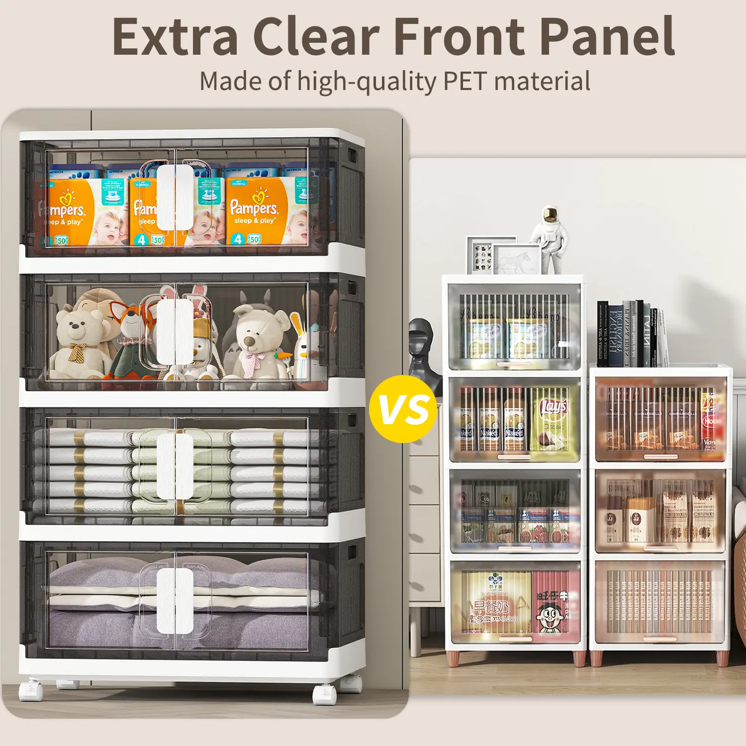 ·Clear front door allows quick access without removing stacked items. Easy to find and get what you need - perfect for everyday use in closets or children's rooms.