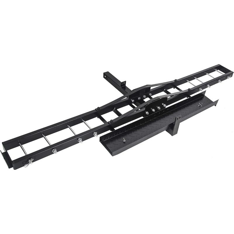 ·CARRIER PARAMETER - Main hitch tube: 18"(L); Loading ramp: 38.5"(L) x 4.75"(W); Carrier overall dimensions: 76"(L) x 7"(W). PLEASE NOTE:Trailer hitch pin not included!! Including installation instructions