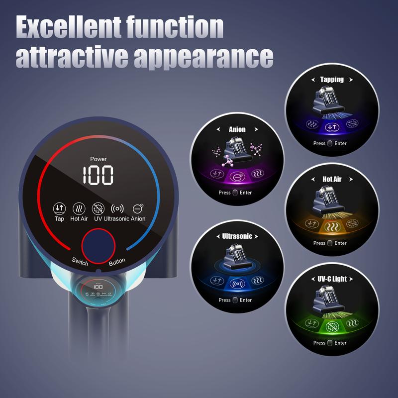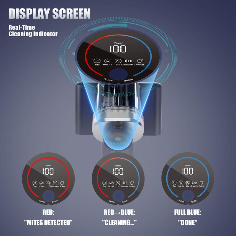 UV-C Sterilization uses medical-grade UV-C light to kill 99.9% of bacteria and dust mites on surfaces. It also features a real-time progress indicator with a smart color-changing display (RedBlue) for quick monitoring of the cleaning status.