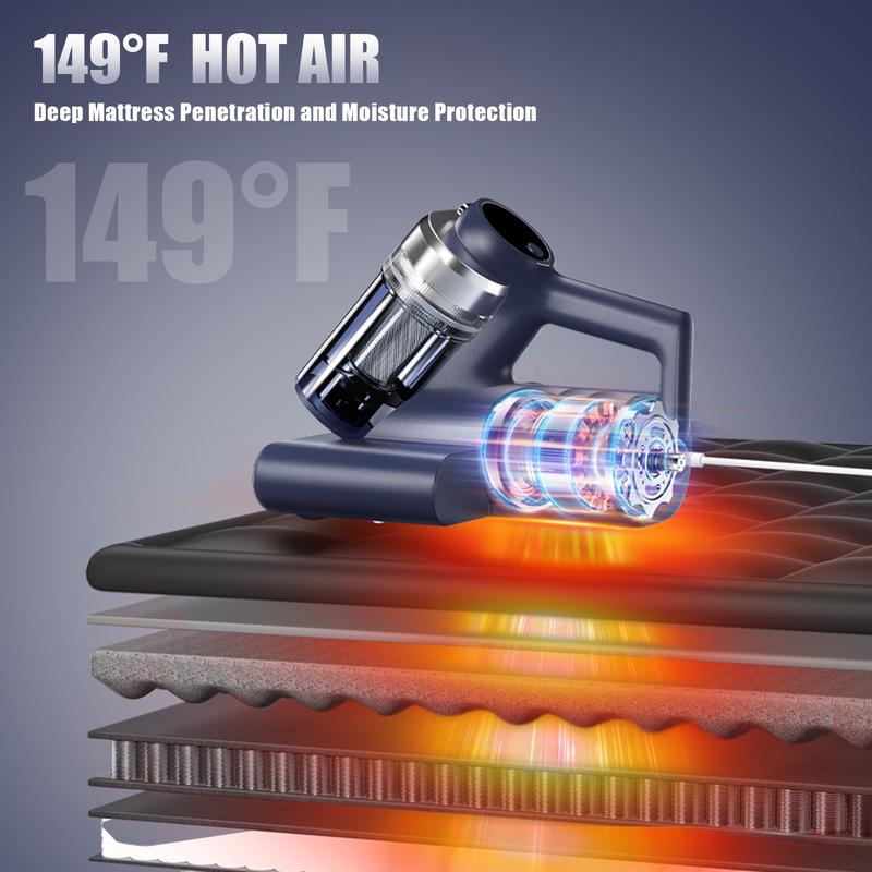 Patented 149°F hot air technology eliminates mites at all life stages by breaking down proteins. The dual-cup separation system captures small particles and removes skin flakes. The one-click removable dust cup is fully washable, requiring no tools for maintenance.