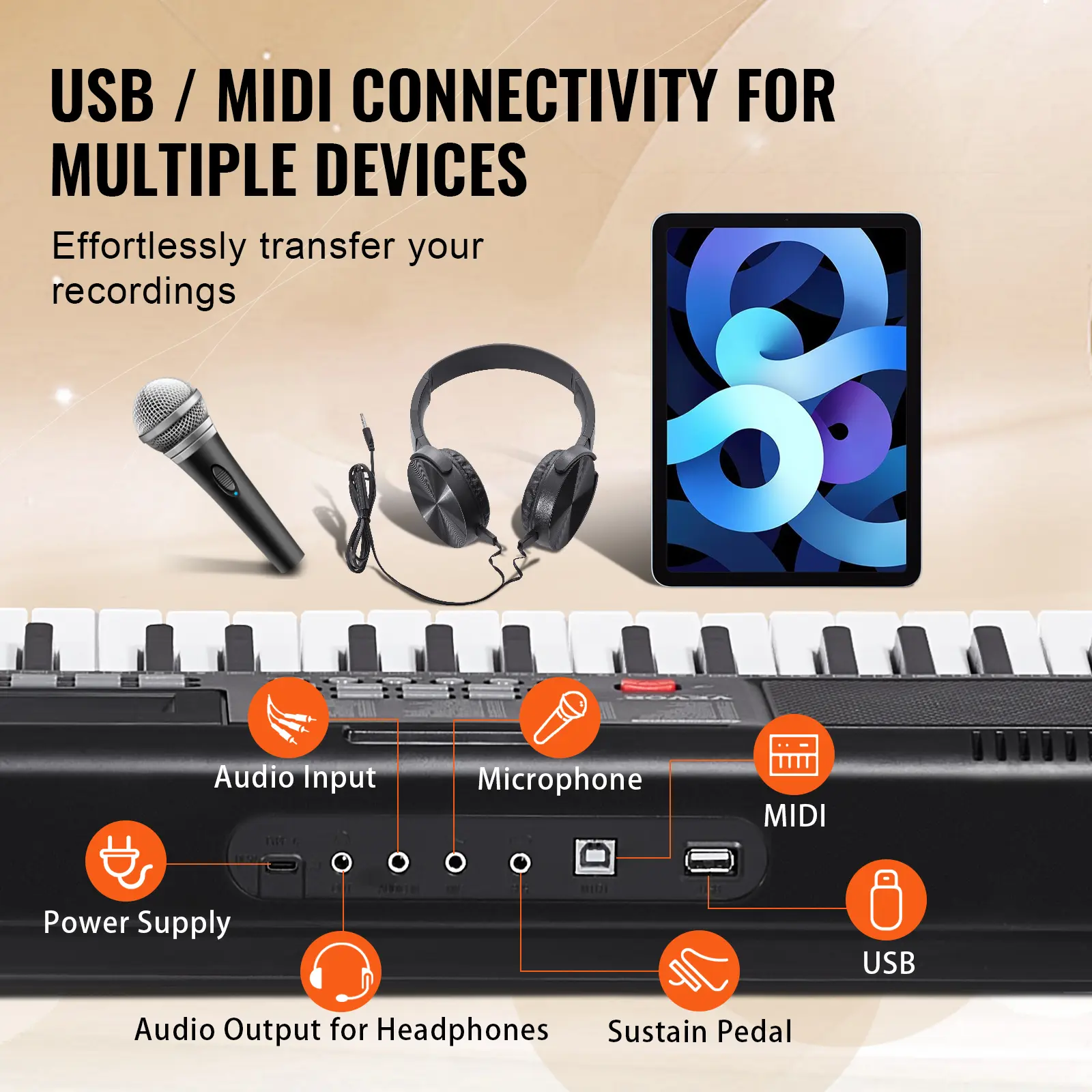 • Supports Multiple Device Connections: Equipped with audio output, microphone input, audio input, power supply, USB port, MIDI transmission, and sustain pedal input, this digital keyboard piano seamlessly connects to computers, tablets, sustain pedals, and more. Enjoy versatile connectivity options for a flexible musical experience.