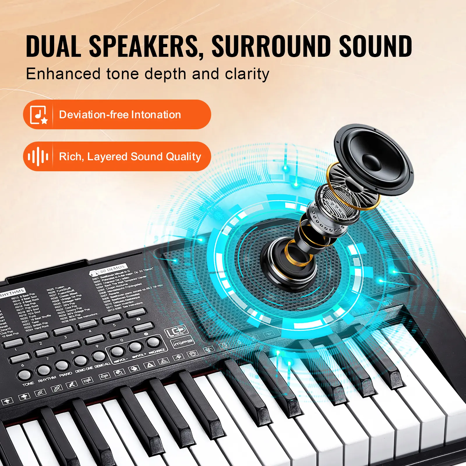 • Stereo Surround Sound for Every Note: Experience a rich, layered sound with built-in dual speakers that deliver true-to-life sound. We provide surround sound effect that accurately reproduces every note, ensuring clear pitch with distinct highs and lows for a fully immersive listening experience.