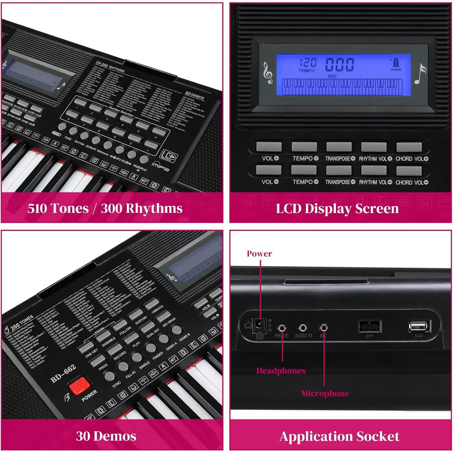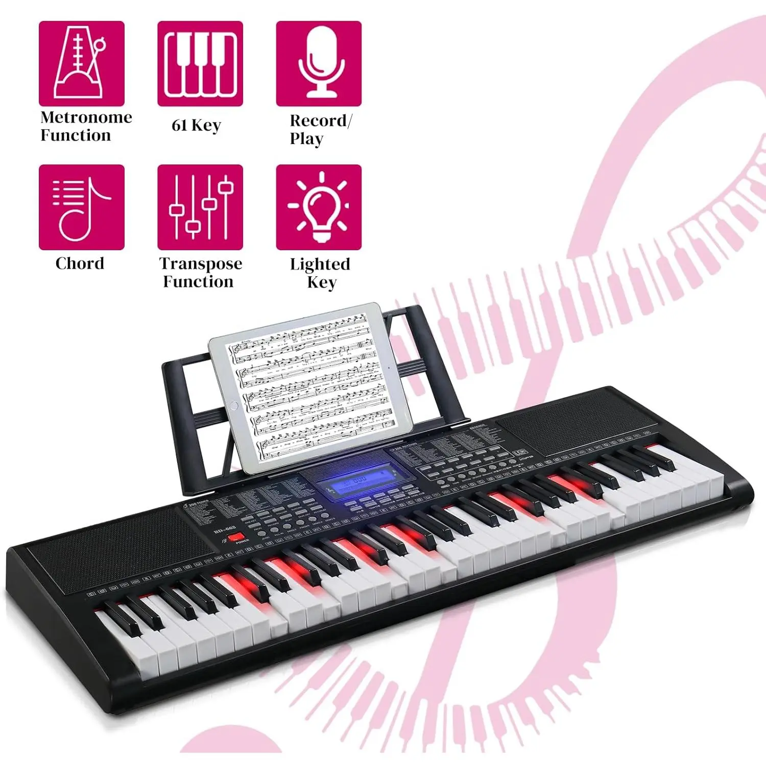 MULTI FUNCTIONAL ELECTRIC KEYBOARD PIANO: Designed with 61 keys, 510 timbres, 300 rhythms, 30 demo songs, 61 types of keyboard percussion. Features sound volume adjustment, multi-tone selection, metronome function, teaching functionsound recording, playback function, split/touch control function and so on. The rich features make you immersed in the world of music.