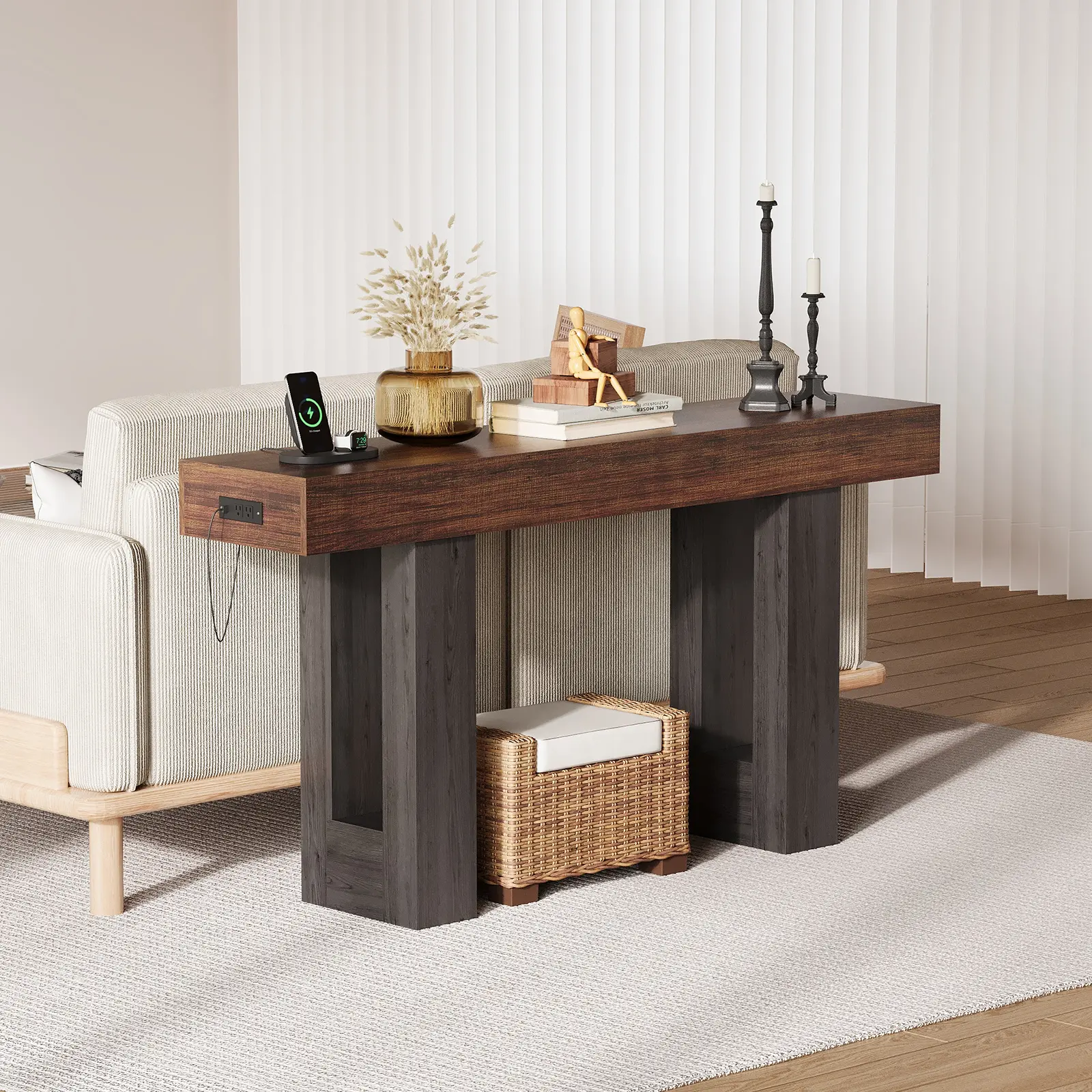 Enhance your home with this extra-long sofa table, expertly crafted to blend contemporary convenience with timeless farmhouse charm. Designed for versatility and function, it’s the perfect addition to entryways, behind couches, or along hallways—wherever style and smart utility are needed most.