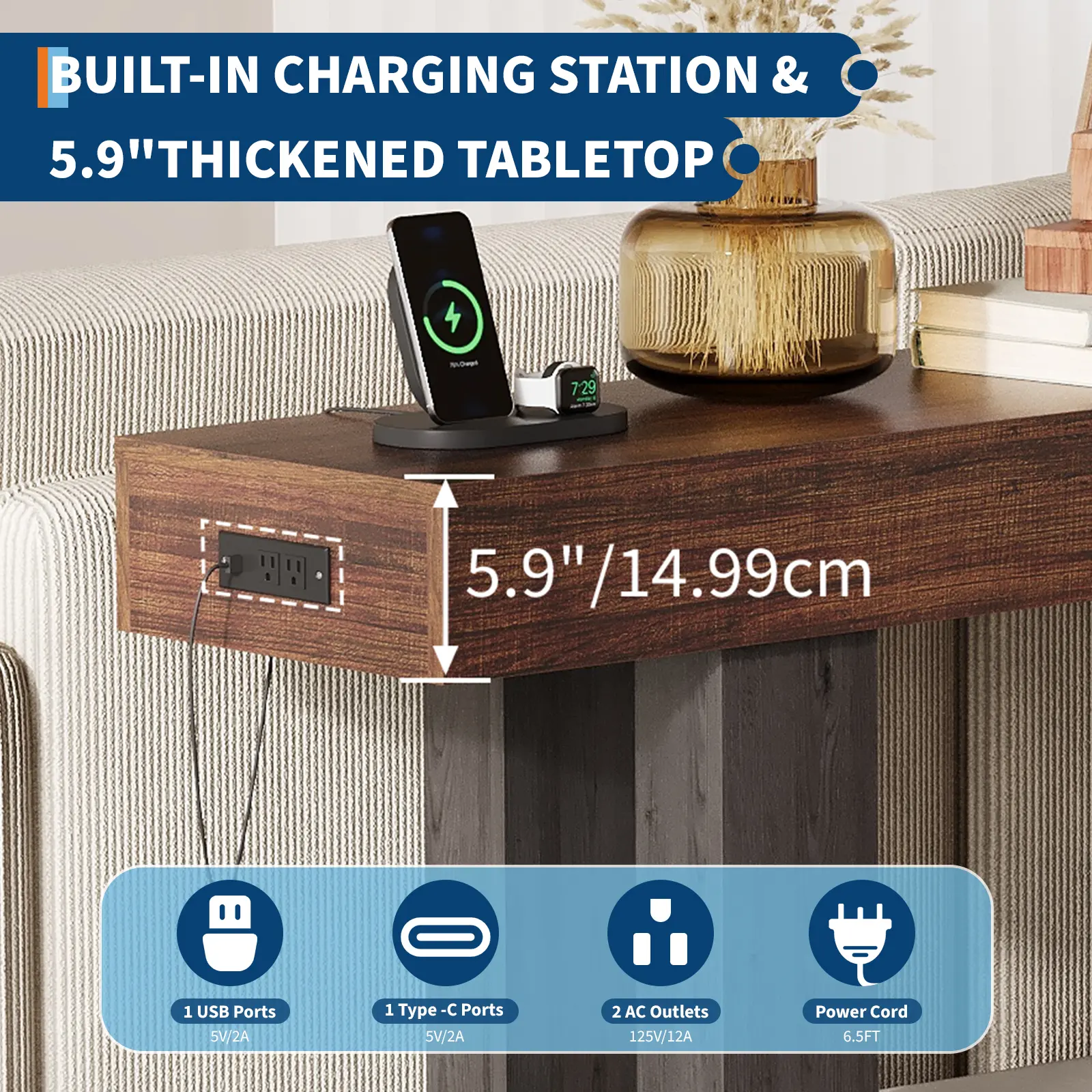 ·Integrated Charging Station: Featuring 2 AC outlets (125V/12A), 1 USB port (5V/2A), and 1 Type-C port (5V/2A), conveniently built into the tabletop. Effortlessly power up your phones, tablets, or lamps with a 6.5 ft (2 meter) power cord for easy reach.