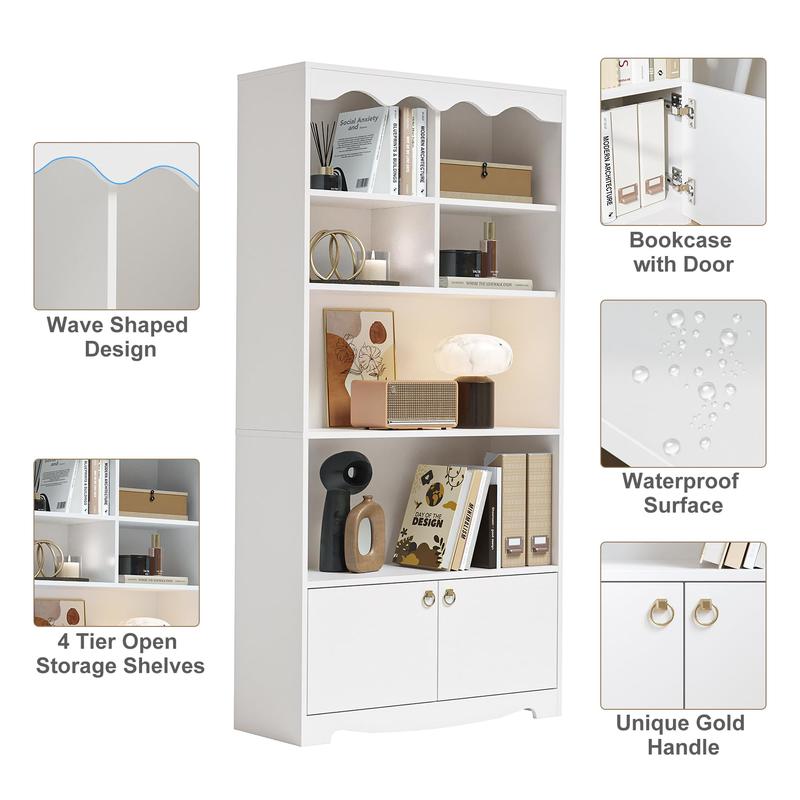 [Modern Waveform Design in White Finish] Featuring a clean white finish and a soft waveform top, this modern bookcase blends simple lines with textured detail. Elegant gold handles on the cabinet doors add a refined touch, making this display storage shelf a stylish focal point in any home office, apartment or living room.