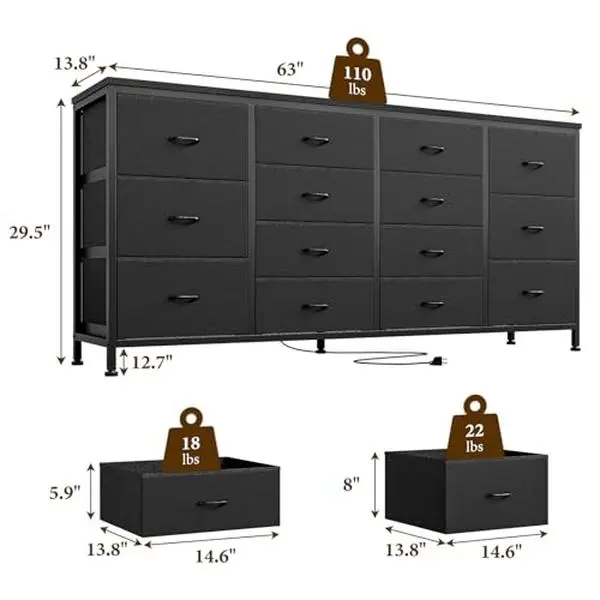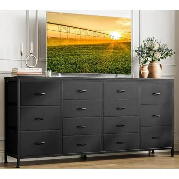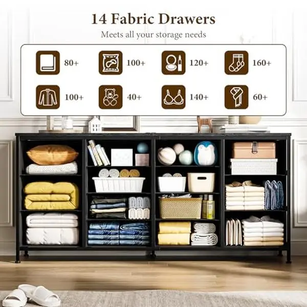 ·14 Drawers TV Stand - 2 Types Drawers Separate Storage: Forget searching through piles! Each drawer opens smoothly, giving you quick access to remotes, DVDs, clothes, blankets, toys, socks, trousers, and more, making your life easier and more efficient.